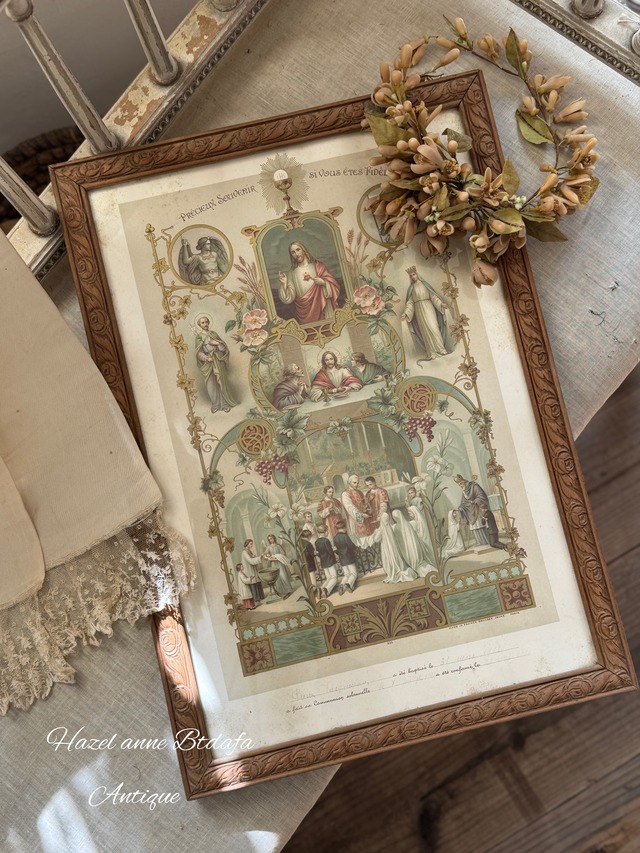 ◾️1900s初期 フランスアンティーク 初聖体拝領(Communion)の記念ガラスフレームです。 最初の聖体拝領(プルミエ・コミュニオン)」の儀式の様子が描かれ、その周囲に洗礼式や最後の晩餐などの宗教的な場面が配置されています。バラ、ユリ、ブドウの蔓、麦の穂といったキリスト教的な象徴が枠を彩っています。 右下に「MADE IN FRANCE BOUASSE JEUNE」とあり、パリの有名な宗教印刷所であるBouasse-Jeune(ブアス・ジューヌ)によるクロモリトグラフ(多色石版画)であることがわかります。 下部には手書きで名前や日付が記入できる欄があり、 フランス製、ボヴァス・ジューヌ社 手書き箇所部分にピエール・タスキリアン(氏名)、3月31日(洗礼日)、洗礼を受けた、初聖体拝領式を行った、堅信式を受けたと記載されています。 h48×w33.5×d1.8cm ¥15800+送料 送料は着払いになります