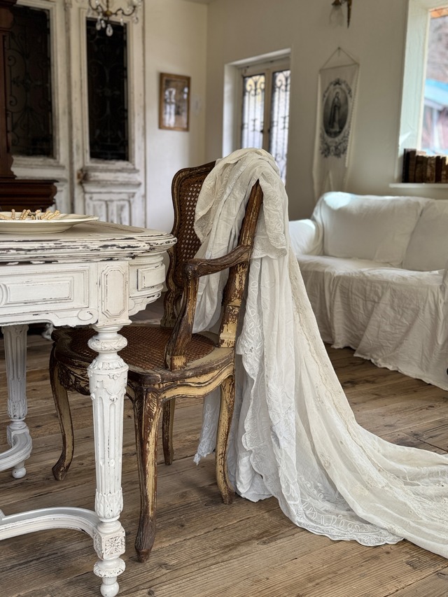 ◾️フランスアンティーク コーネリーレース カーテン 繊細なチェーンステッチの刺繍が特徴的なフランスのアンティーク・コーネリーレース(Cornely Lace)カーテンをご紹介致します。 非常に薄く柔らかなコットンローン生地が使われていて、チェーンステッチで花や葉、スクロール模様などが描かれています。年月を経たノスタルジックな風合いが特徴です。 縁(リム)は波打つようなスカラップ状に仕上げられているものが多く、光を通すとその繊細な模様が美しく際立ちます。 こちらのアンティークカーテンは、そのまま窓辺で使うだけでなく、間仕切りやパーテーションとしても人気があります。 経年劣化によるアンティーク特有のうっすらとした汚れやシミ、穴や補修跡が見受けられますが、これは長い年月を経て大切に扱われてきた証でもあります。 カーテンとしてはもちろん、状態の良い部分を切り出し、ブラウスやスカートのリメイクやハンドメイド素材としてもご活躍致します。 SizeB 185×125cm ¥14800+送料