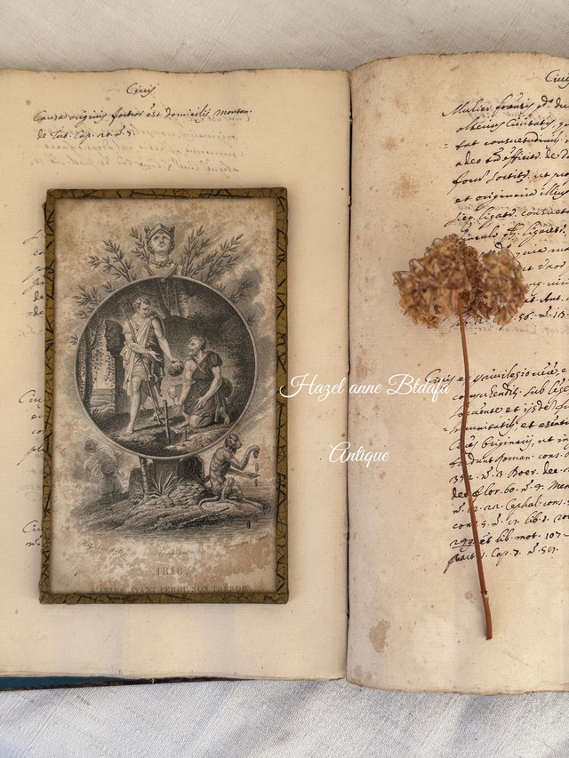 ◾️19世紀初期 フランスアンティーク 銅版画 ガラスフレーム フランスの詩人ジャン・ド・ラ・フォンテーヌによる有名な寓話「農夫と息子たち」の場面を描いた内容の版画になります。 1818年に製作された版画 題名は「AVANT PERDRE SON TRÉSOR」からフランス語で「宝を失う前に」を意味し勤勉さの重要性と労働こそが真の富であるという教訓を伝えています。 経年によるうっすらとした汚れや縁のスレ、ガラスに小さな傷はありますが、割れもなく、ガラス内の版画もまだまだ美しいです。 壁にかけられるようにリング金具も付いています。 h19.5×w11.7×d0.7cm ¥11800+送料