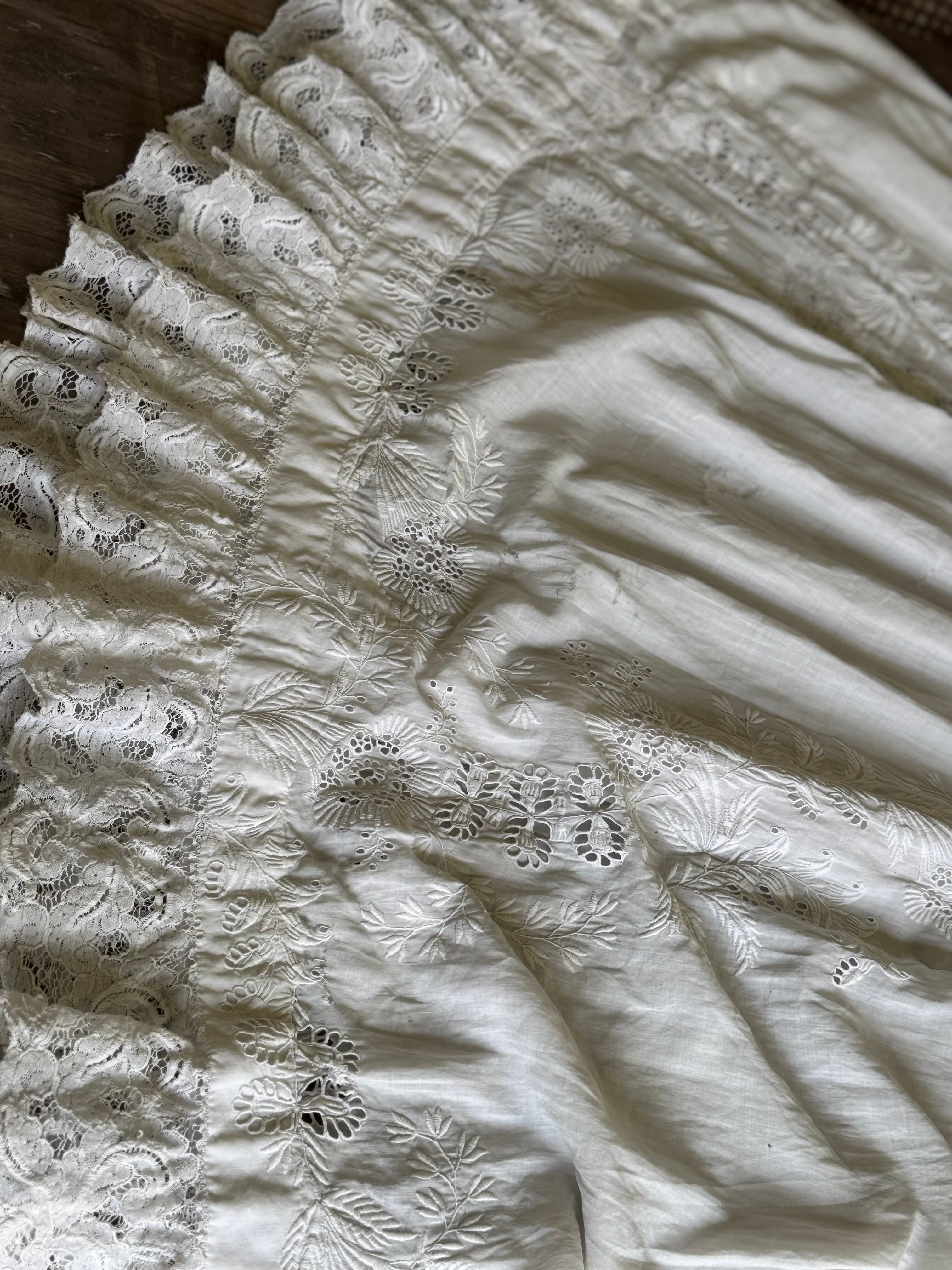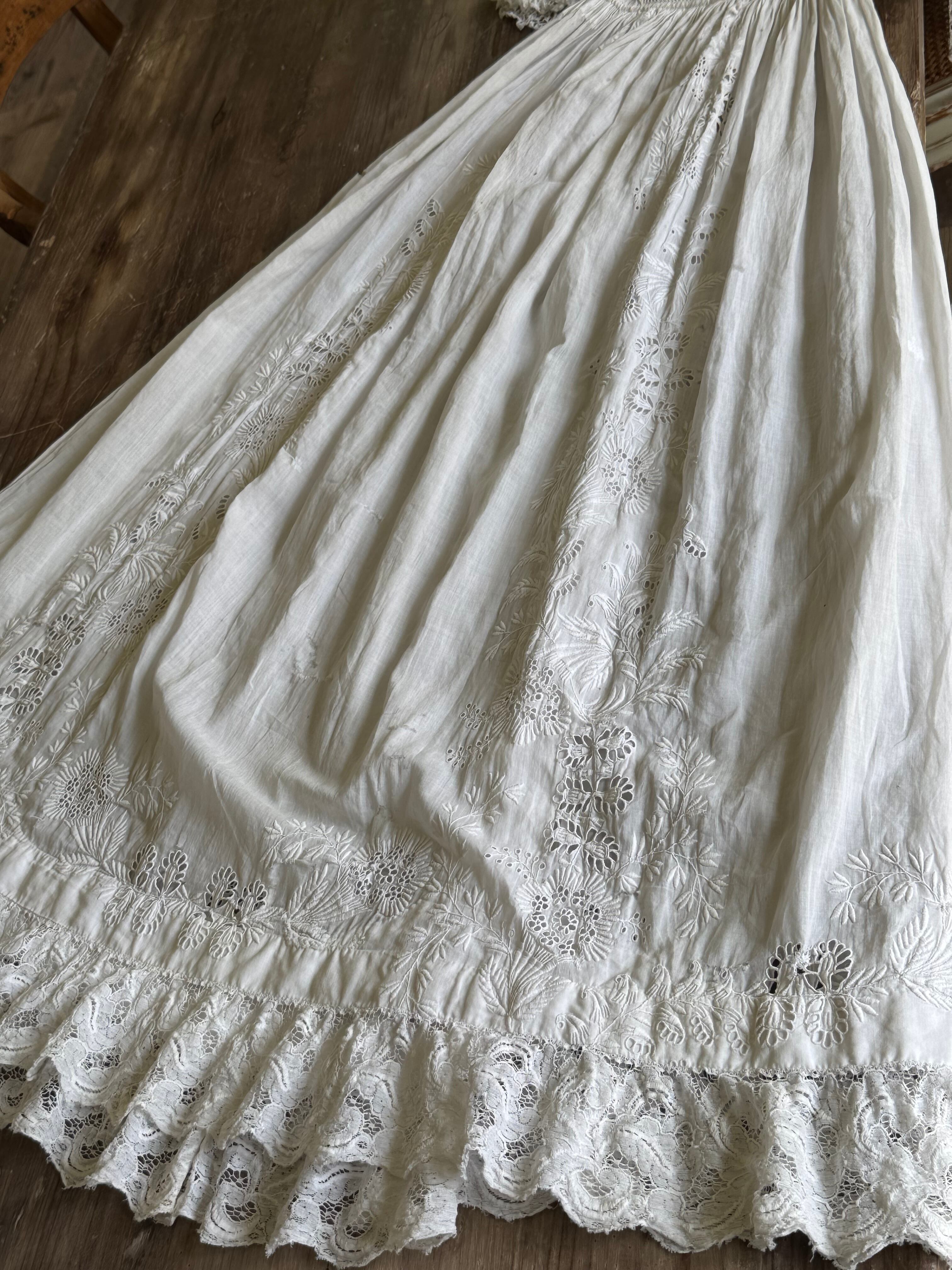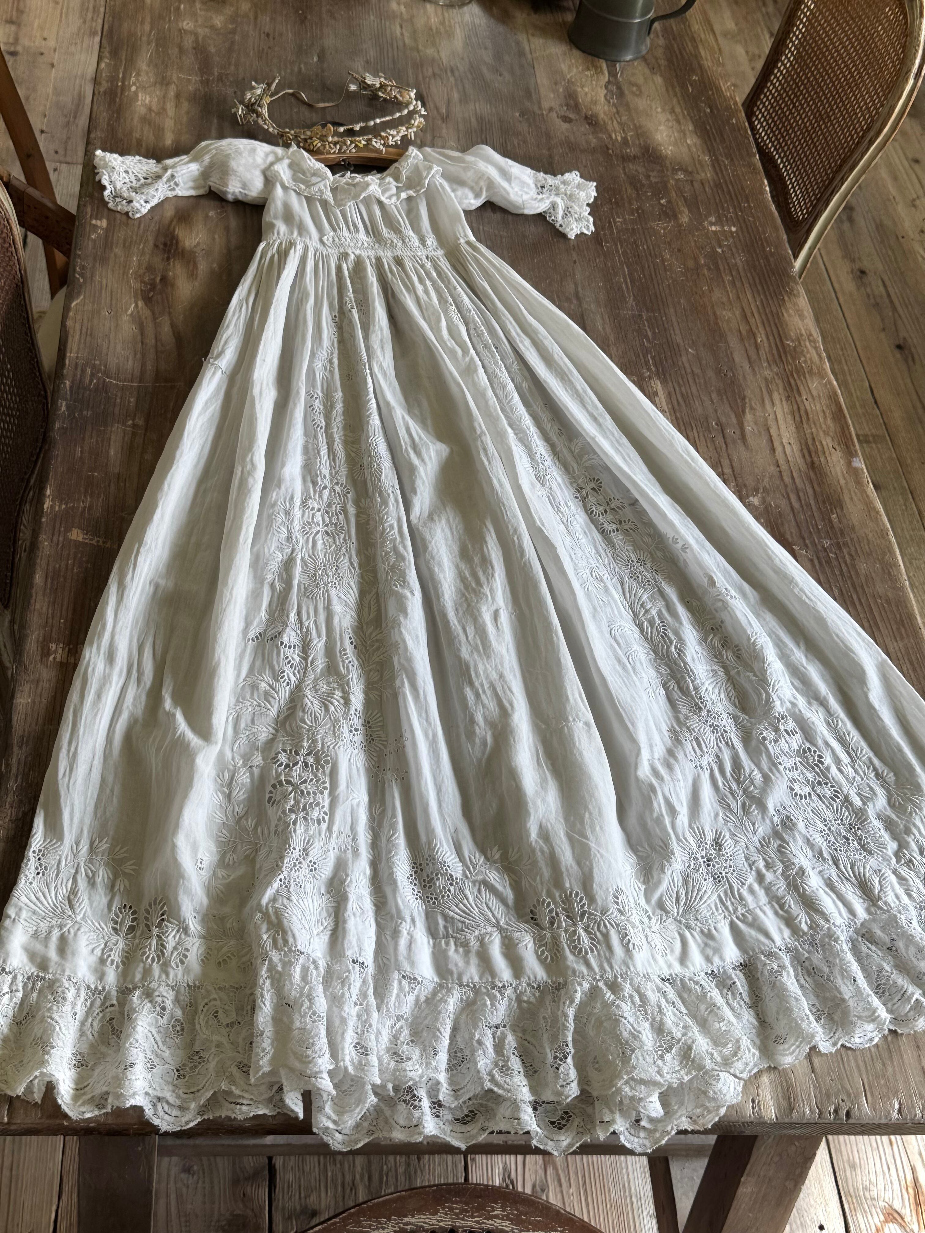 ホワイトワークがたっぷりと施され、スカート裾にはレースがあしらわれた美しい洗礼式用ベビードレス。薄手の柔らかいコットン生地に小さなホールや一部破れ、手直し跡が見られます。リメイクやディスプレイには充分綺麗にお楽しみ頂けます。