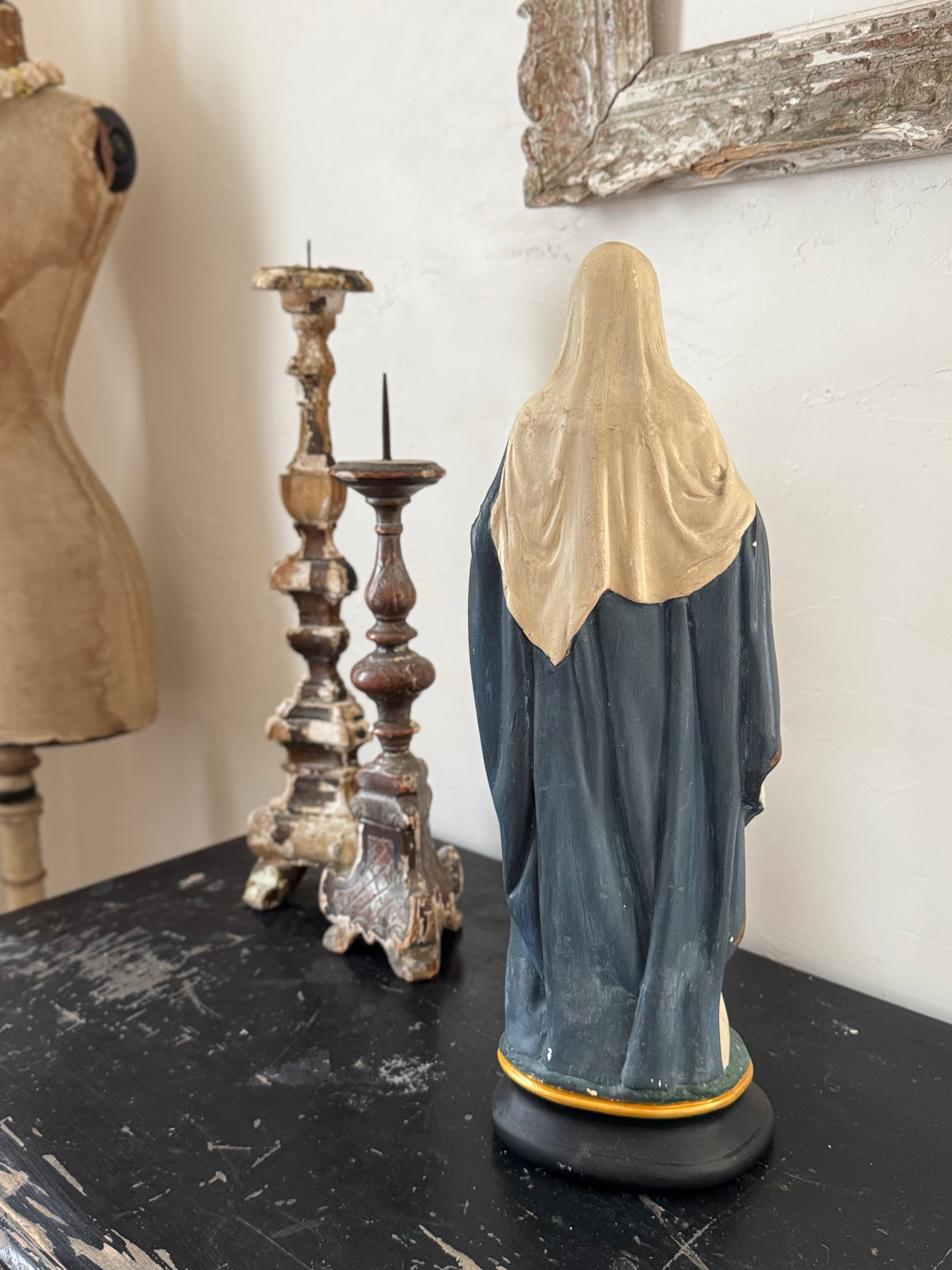 ずっしりと重みのある石膏製に手彩色にて描かれた優しいお顔の表情、ブルーのローブに白いベールはマリア様を象徴するカラーです。ドレープの一つ一つのシルエットは正面背面共に美しいシルエットで眺めているだけで清々しい気持ちになります。
