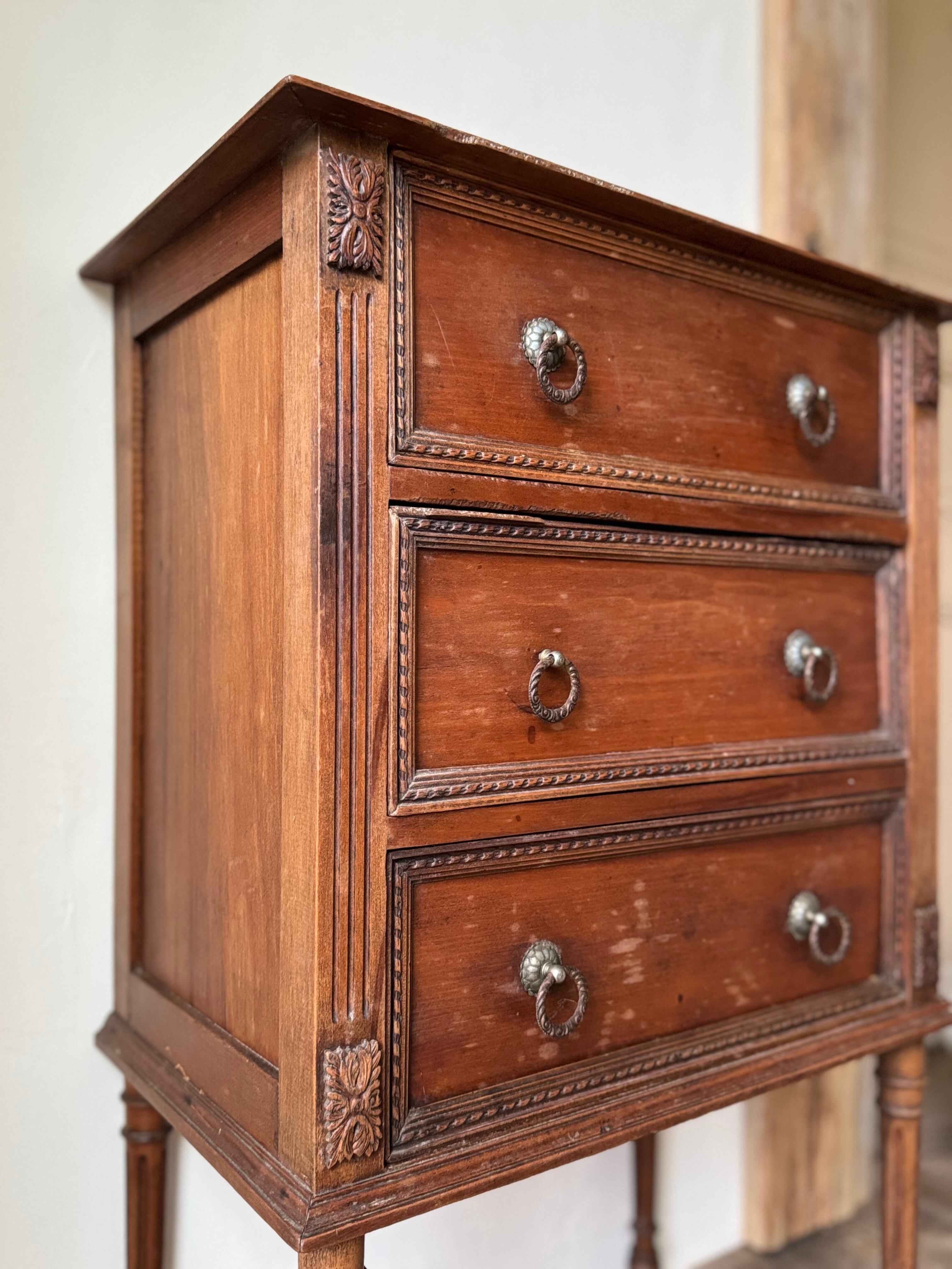 全体的には良好なコンディションですが、経年による微細なキズや擦れが見られます。引き出しはスムーズに開閉可能、金具は錆びが若干見られますがアンティークならではの深い味わいが増しており、おしゃれなインテリアとしてお部屋を彩ってくれるでしょう。