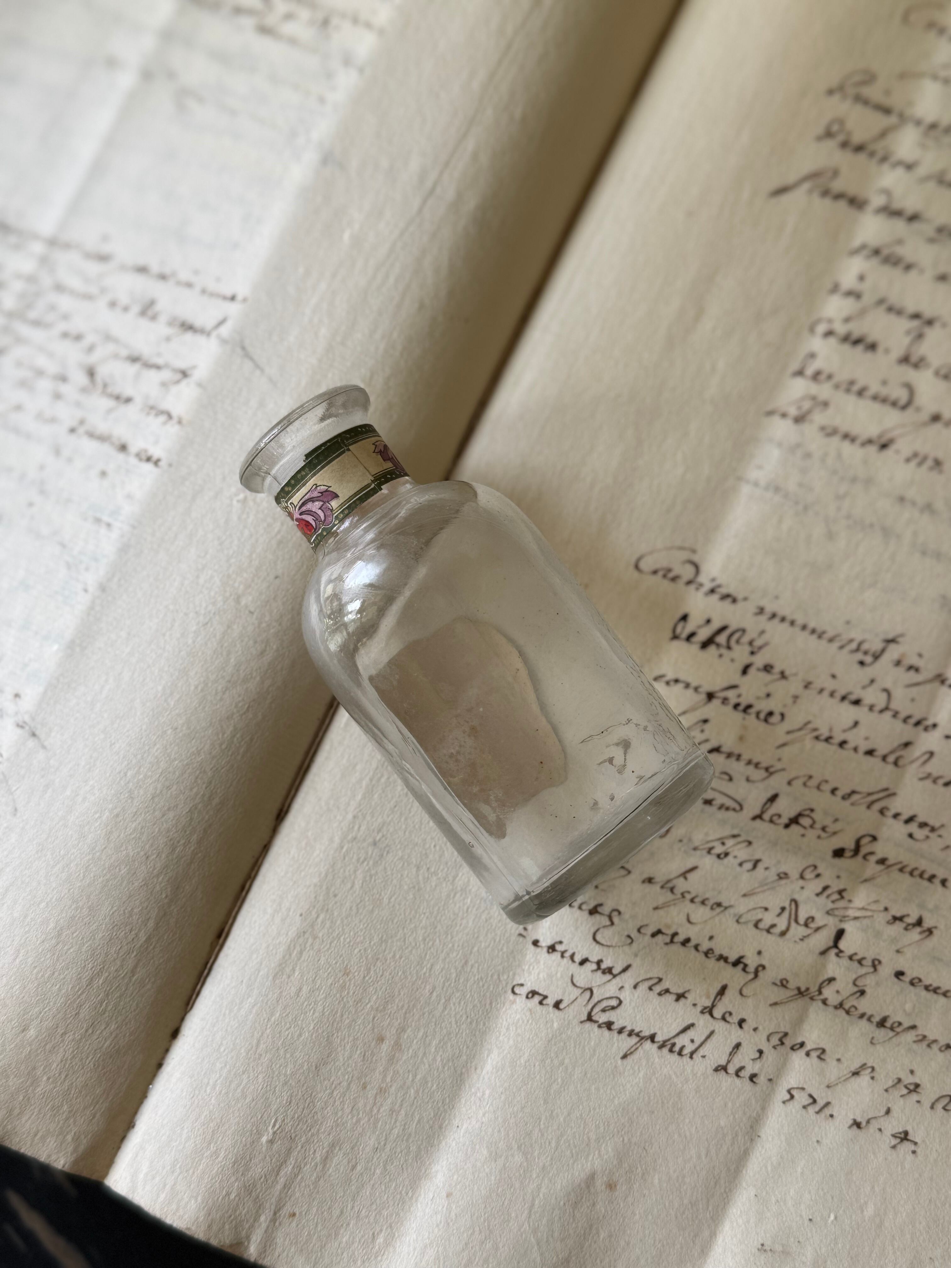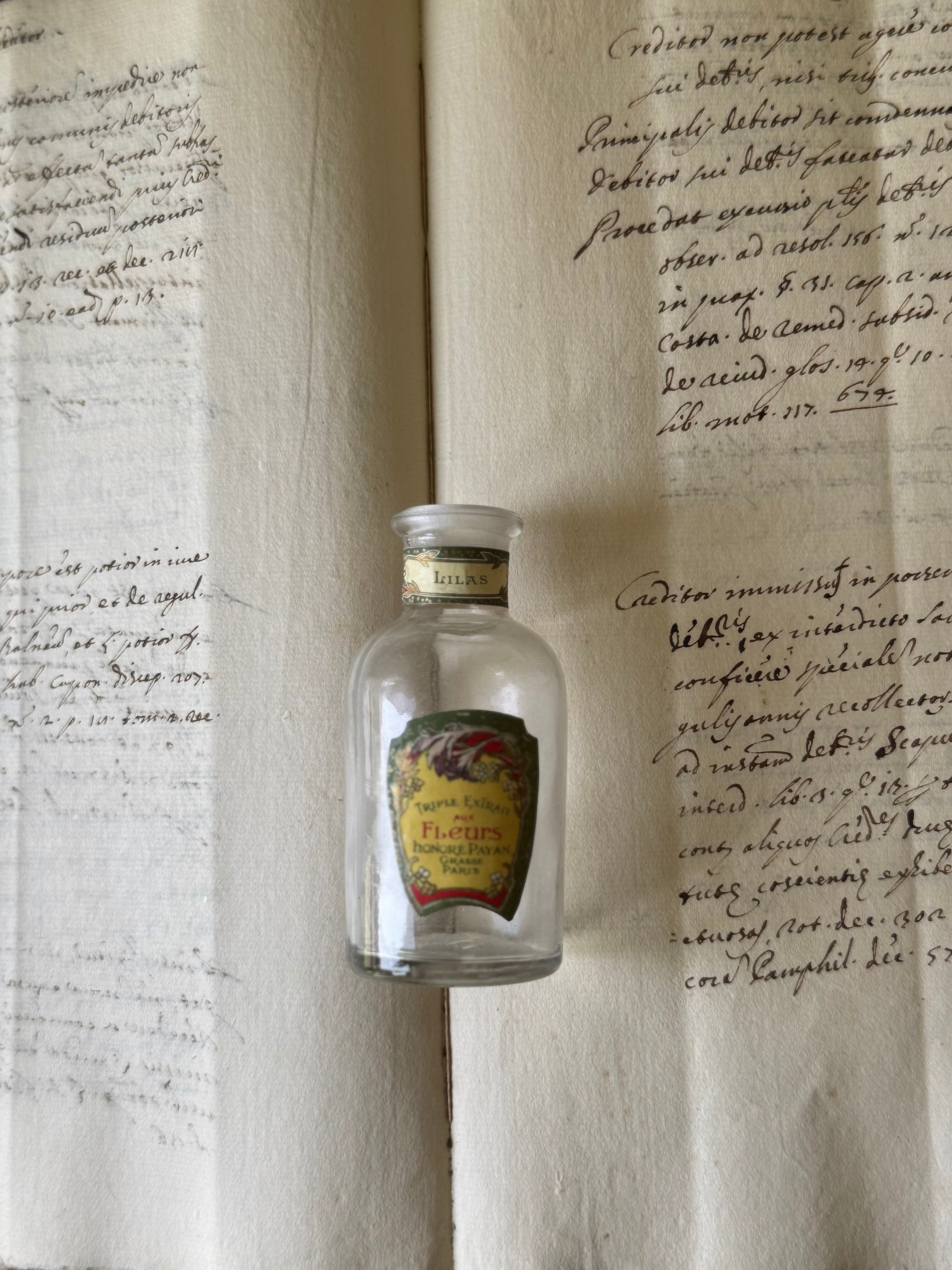 お花のラベルの美しいアンティークのパフュームボトルです。ローズやリリー、スミレなどの香りがセットになっていたパフュームの中の2つのシリーズの物。