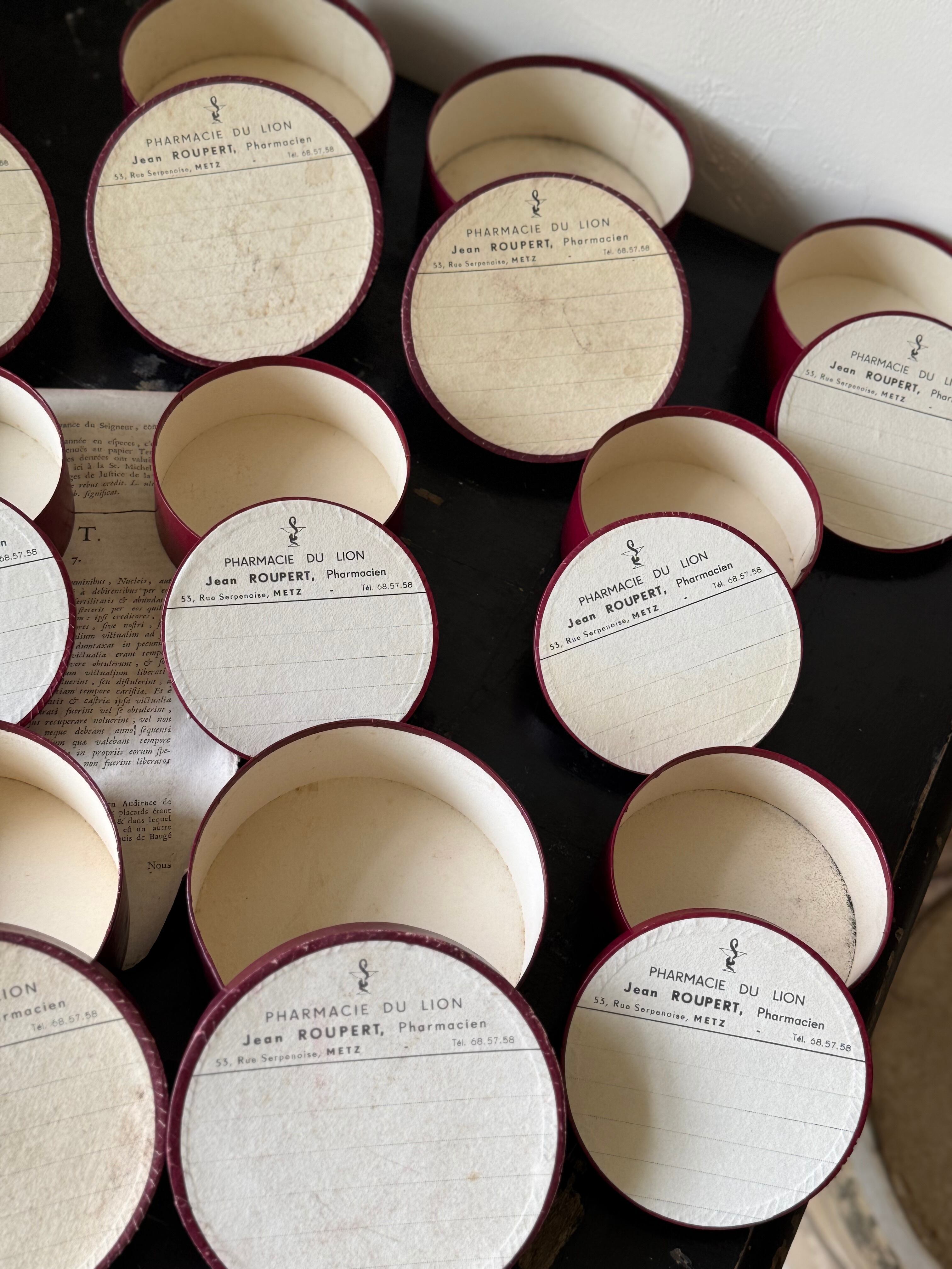 ボルドー色のファーマシーボックス、厚紙でしっかりしています。薬剤師の名前と住所、電話番号が記載されています。