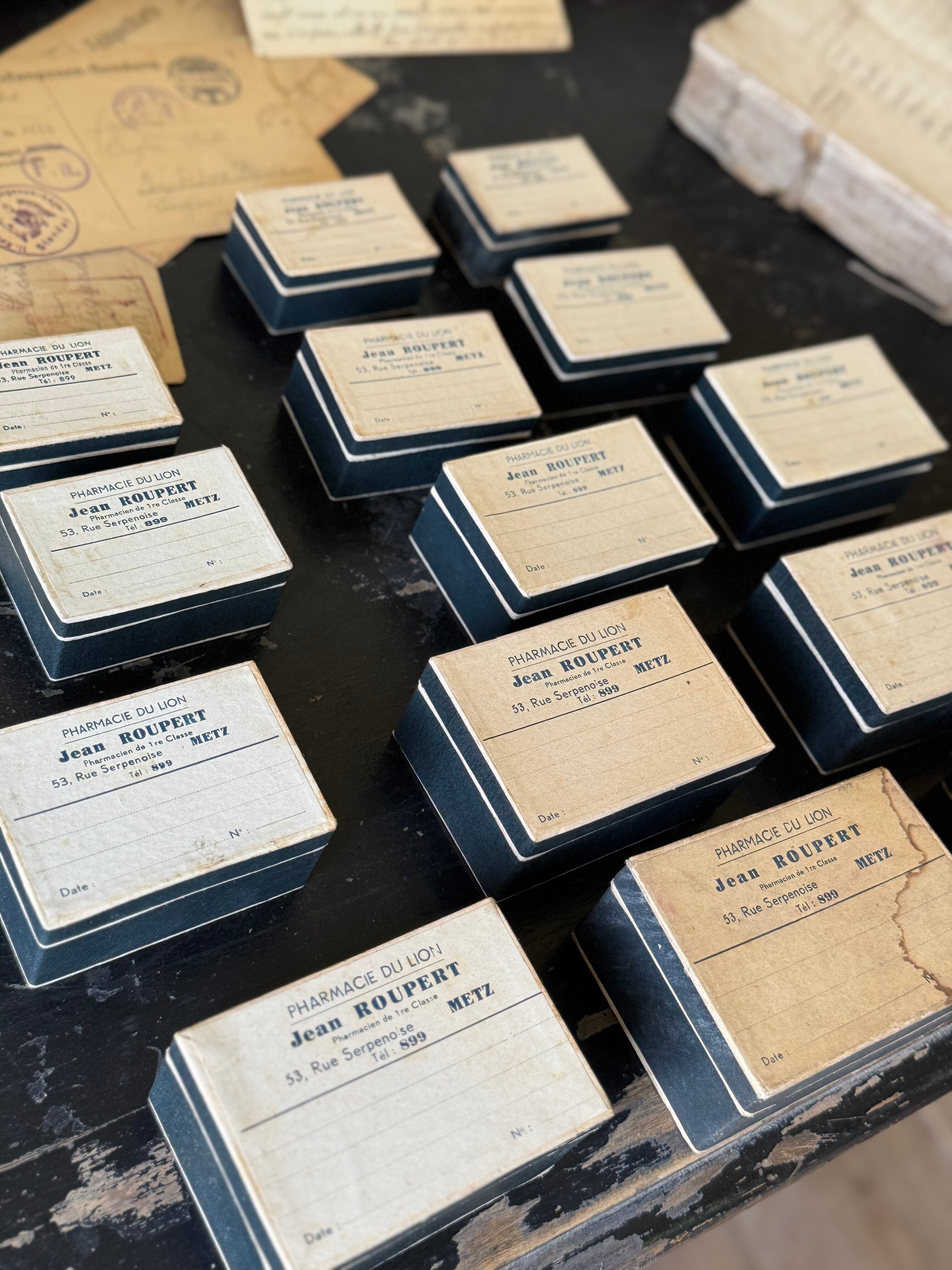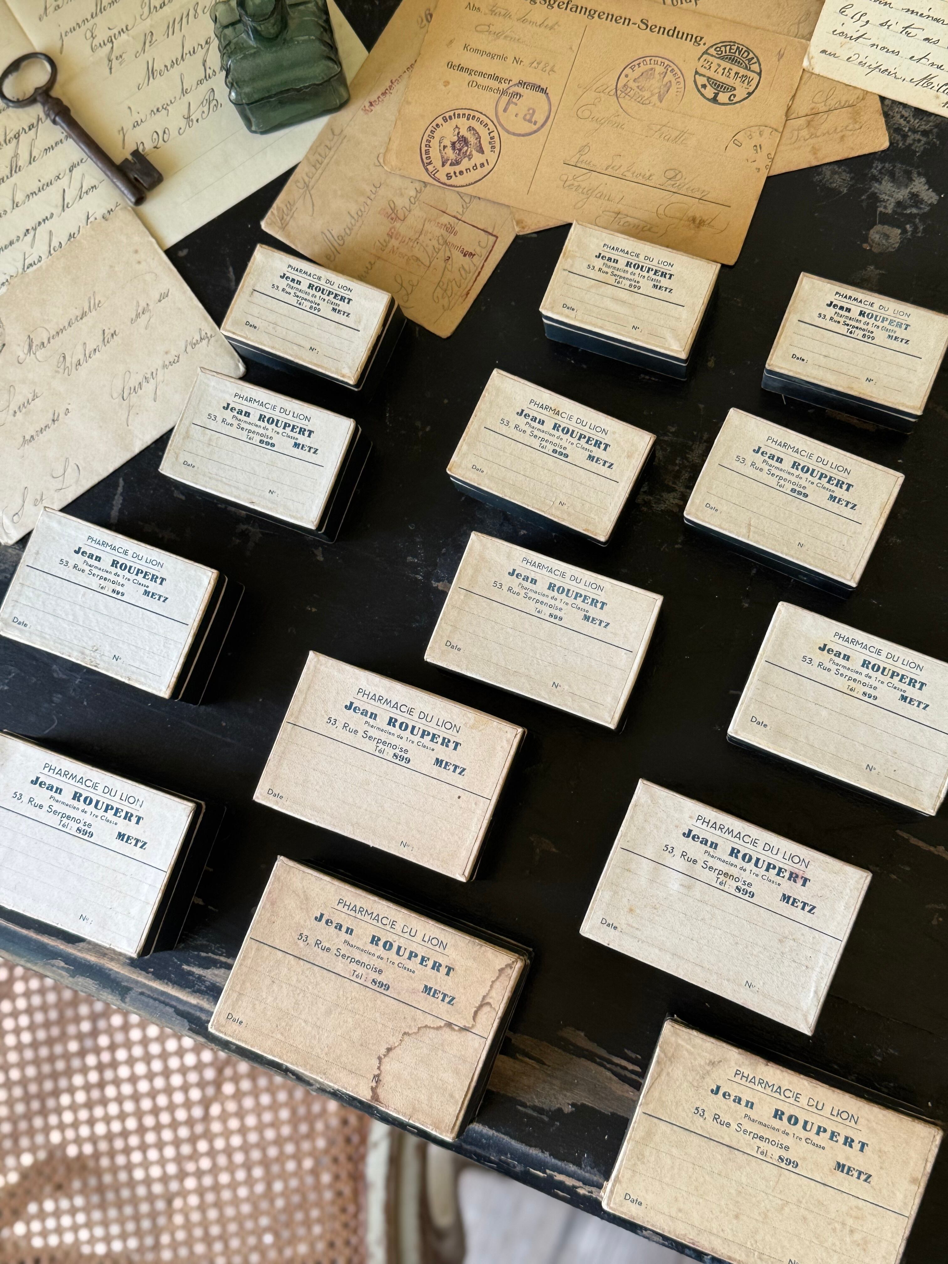 フランス製のアンティークファーマシーボックスが1セットでお届け。5つのボックスが含まれており、薬の保管やディスプレイに最適なアイテムです。歴史を感じさせるデザインは、お部屋のインテリアに温かみを添えます。