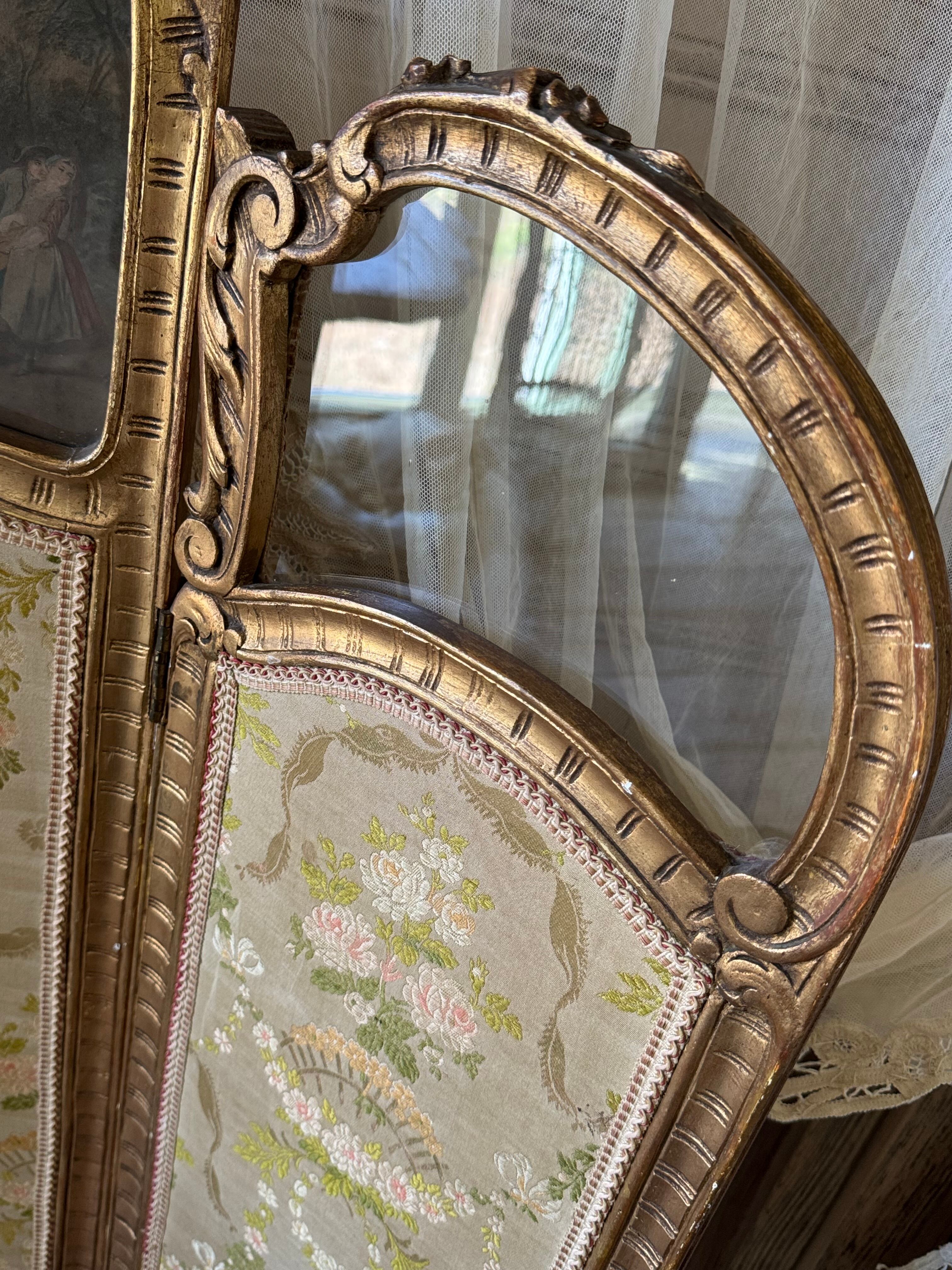 ロカイユフレームの美しい曲線と三連パネルに飾られたガラスにフレンチテキスタイルの薔薇柄のパネルで飾られた大変美しいパーテーションです。