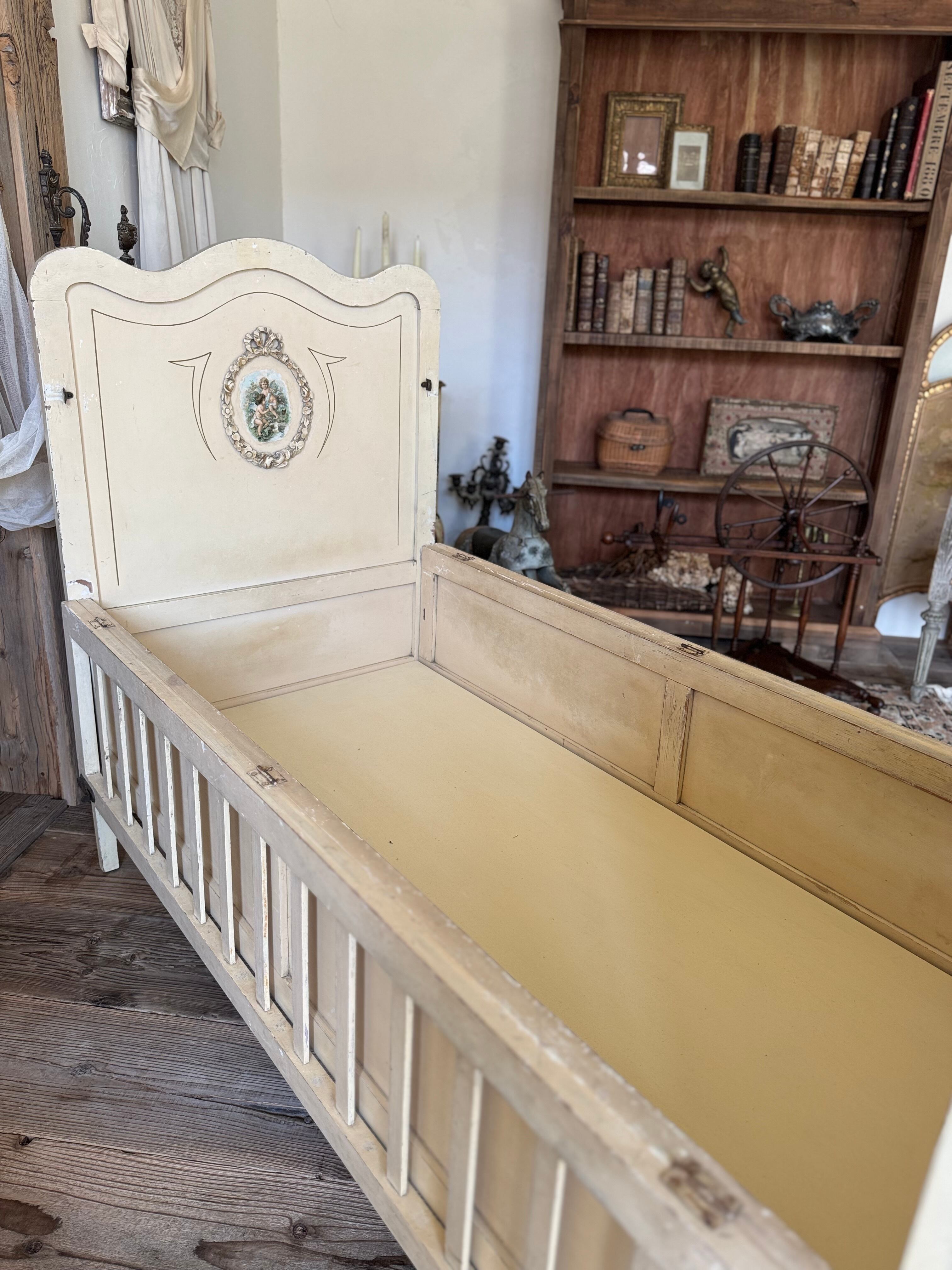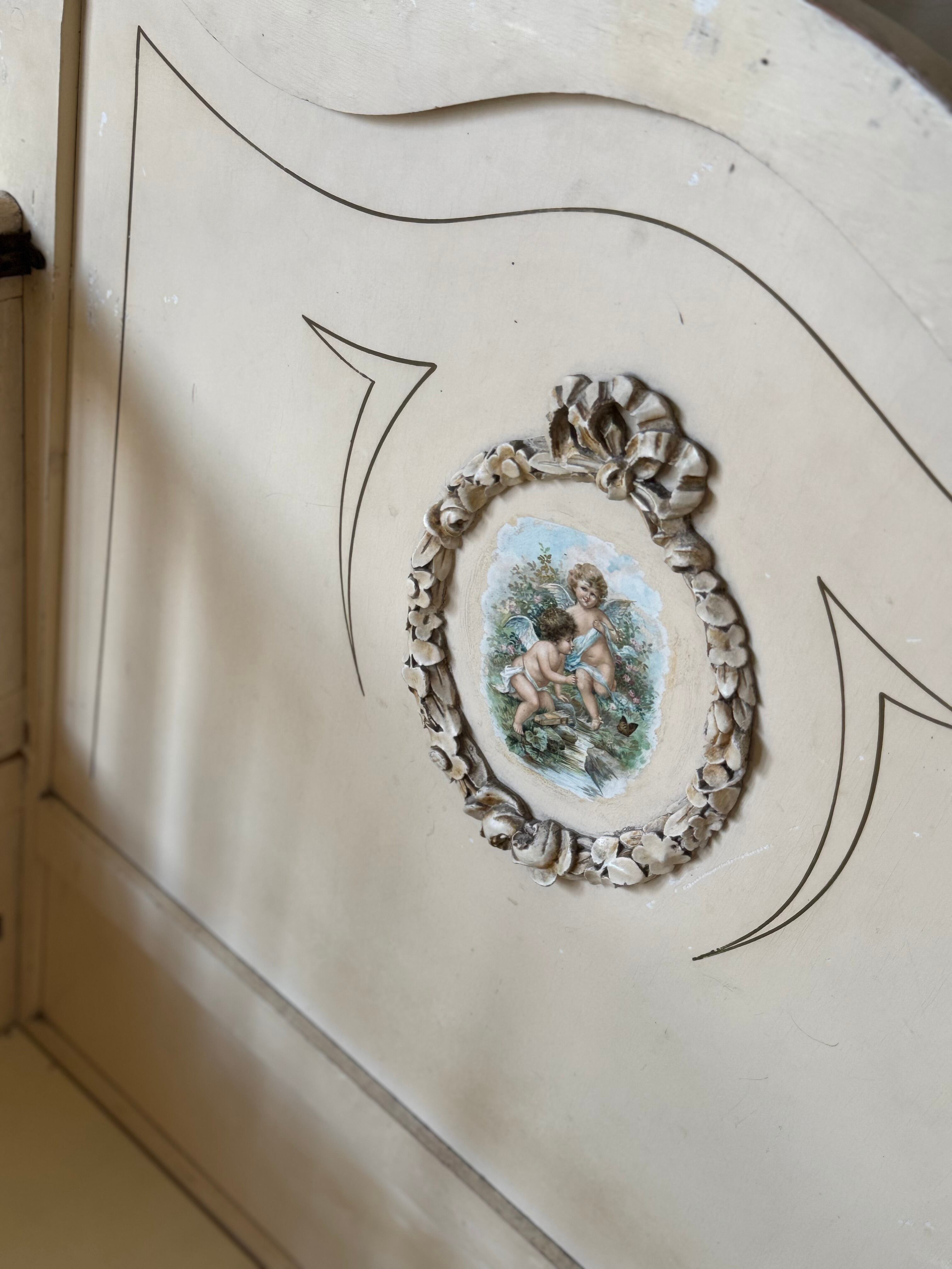 華やかなフランスアンティークのベビーベッド、エンジェルトールペイント仕上げの美しいアイテムです。アイボリーのカラーとリボンレリーフが施されており、どこか優雅で愛らしい雰囲気を漂わせます。