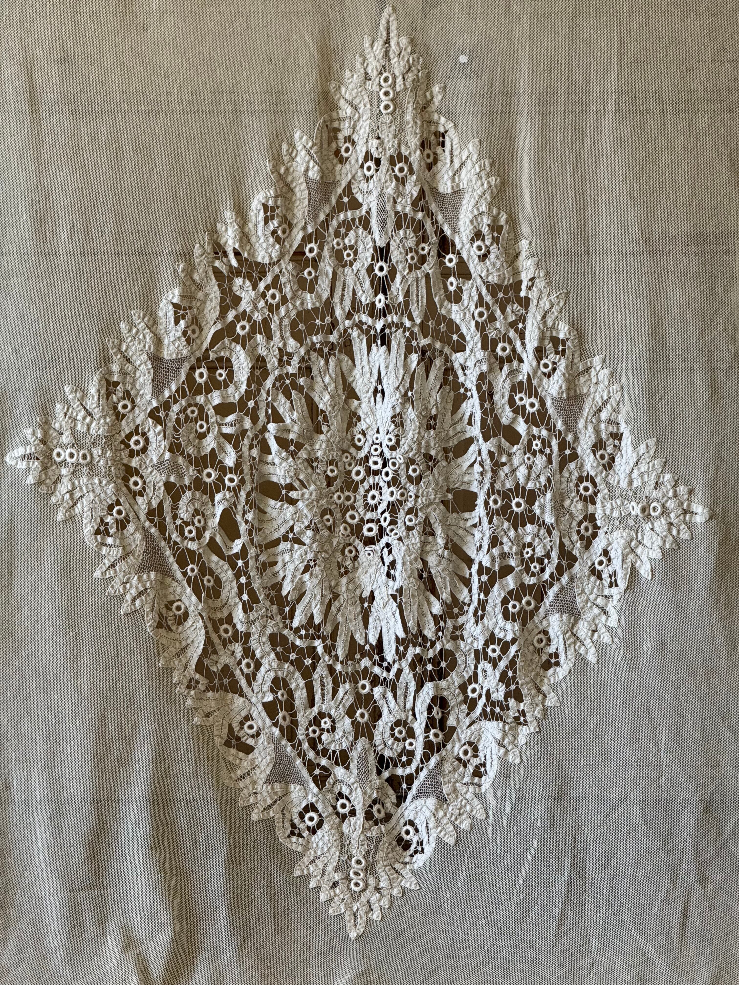 バテンレースは細部にわたり丁寧に施され、華やかさと素朴さを感じさせるナチュラルな仕上がりです。手作りならではの独自の味わい深さがあり、インテリアのアクセントとしても最適です。