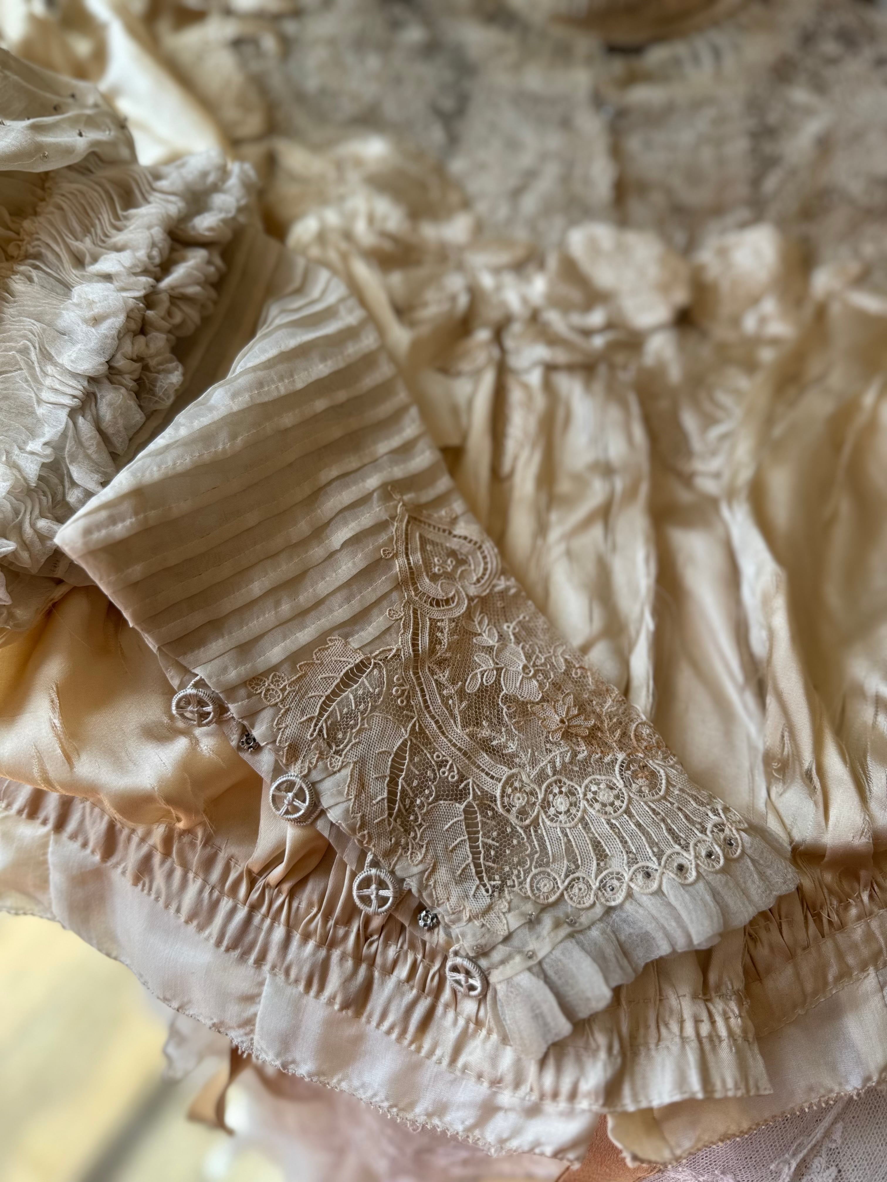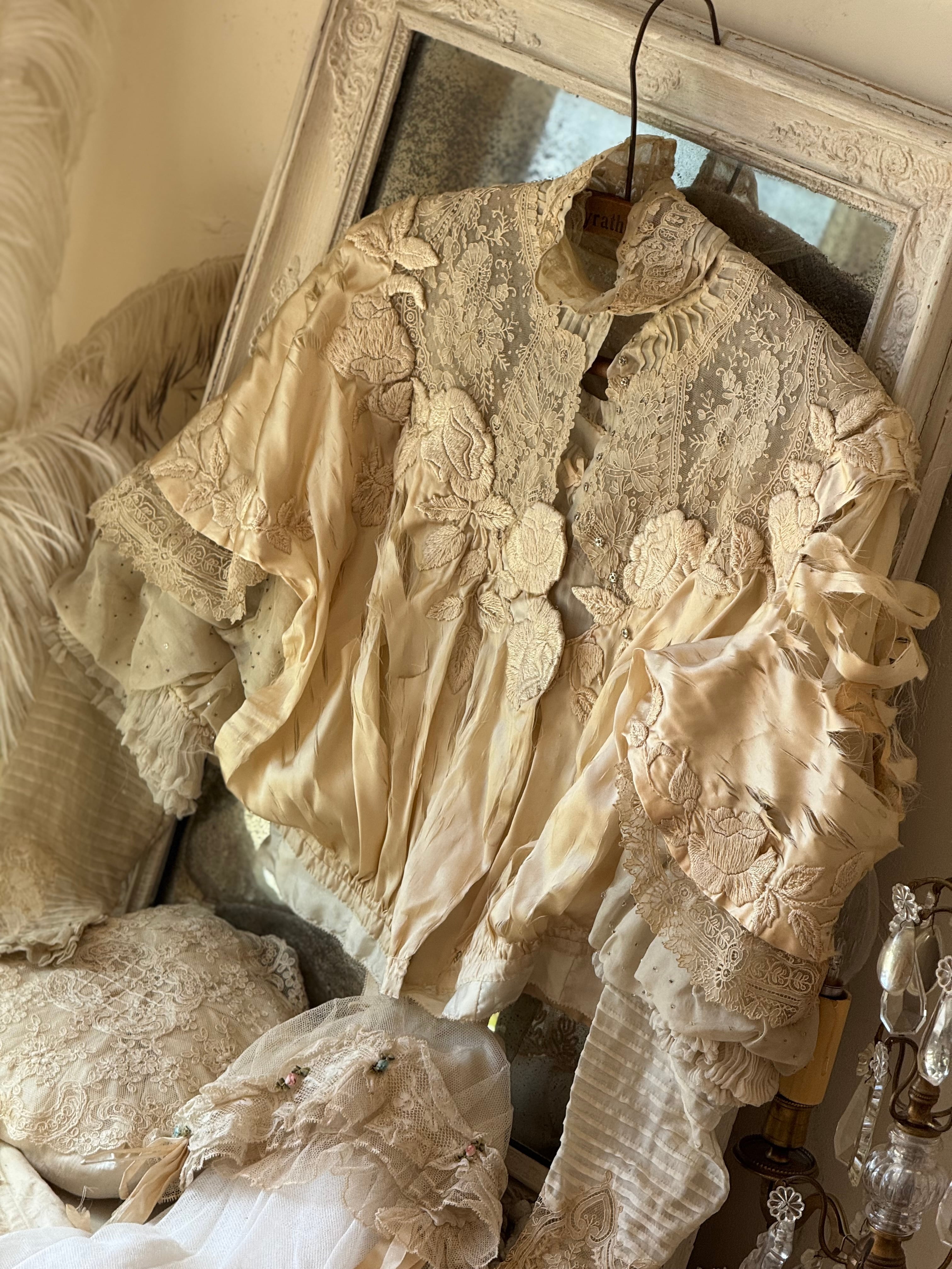 優雅さをまとった19世紀のヴィクトリアンウェディングボディス、1890年代のポワンドガーズレースとシルクが見事に組み合わさった美しいアイテムです。