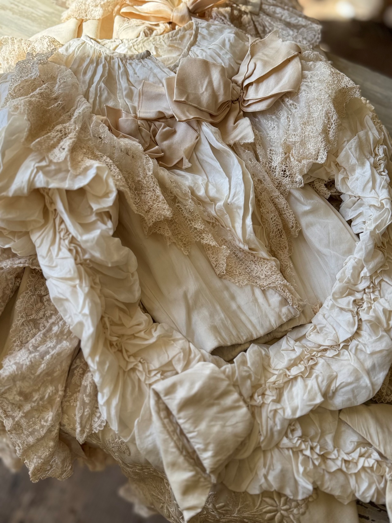 経年による薄っすらとした汚れ、シミ、小さなホール、レース裂けが見られます。またフロント部分の留め具が無い部分がございますが、内側のボーンの破損やシルク生地のダメージはあまり見られないためまだまだ雰囲気よく飾って頂けます。