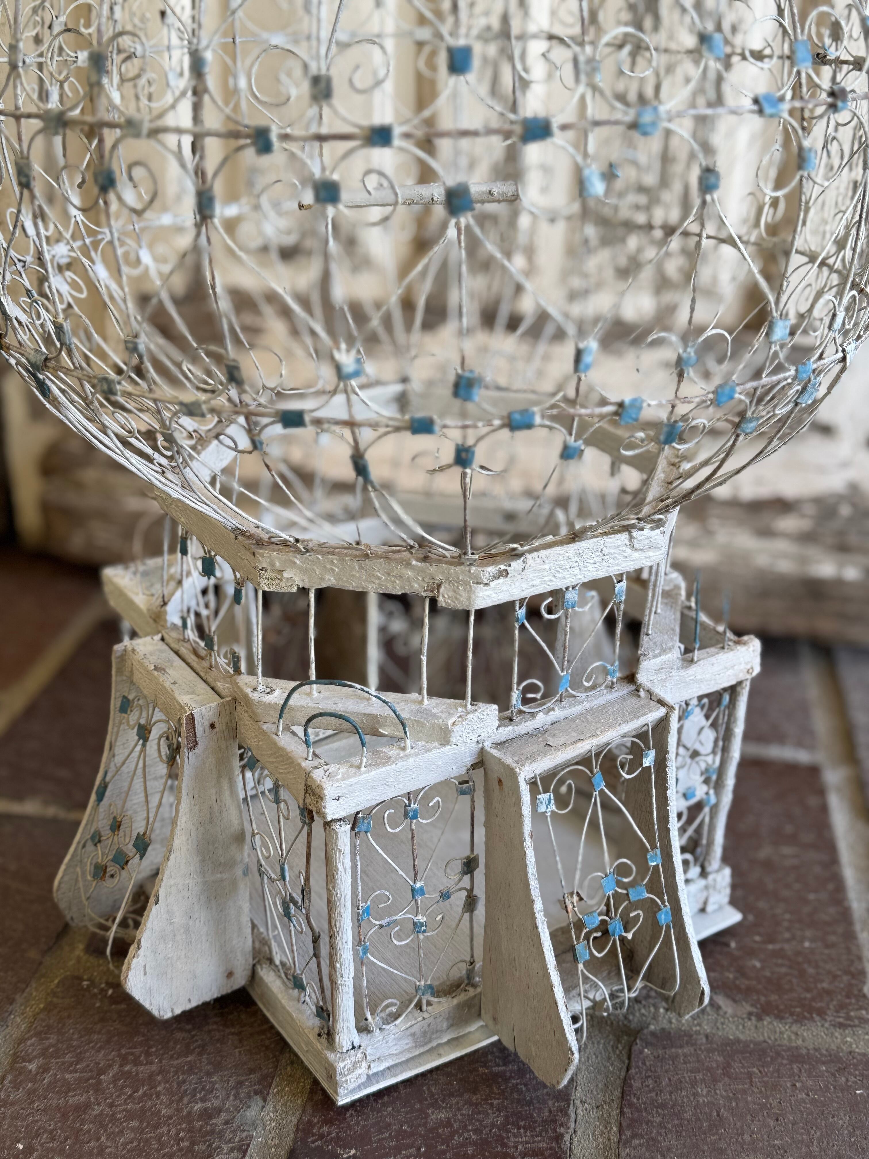 フレンチの魅力を感じさせるエレガントなバードケージは、木とワイヤーのコンビネーションが特徴的です。爽やかなホワイトとブルーの色合いが、どんなインテリアにも調和し、明るく心地よい空間を演出します。