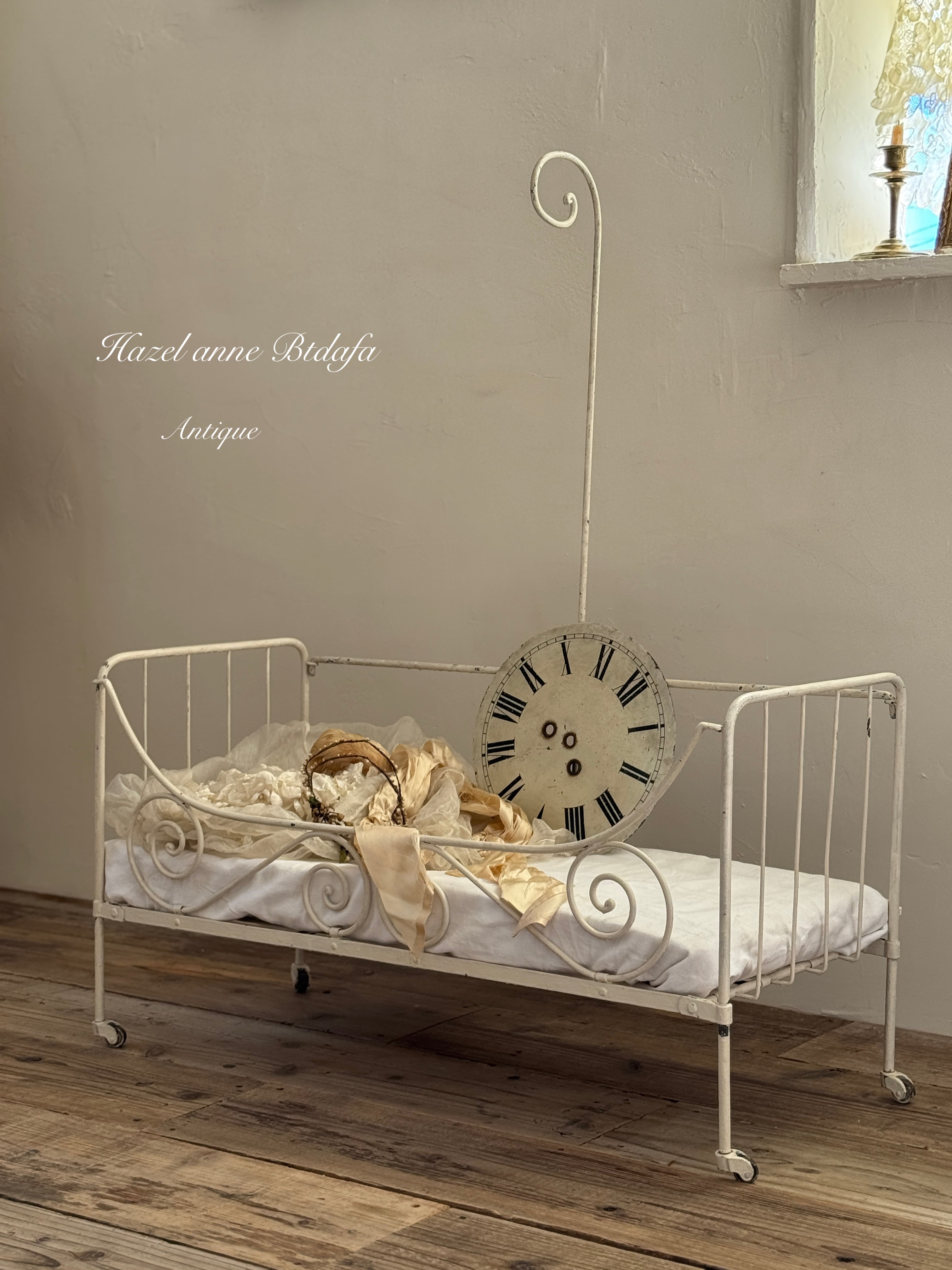 鉄製の華奢で可憐なフォルムが特徴的なアンティークのアイアンドールベッドのご紹介です。