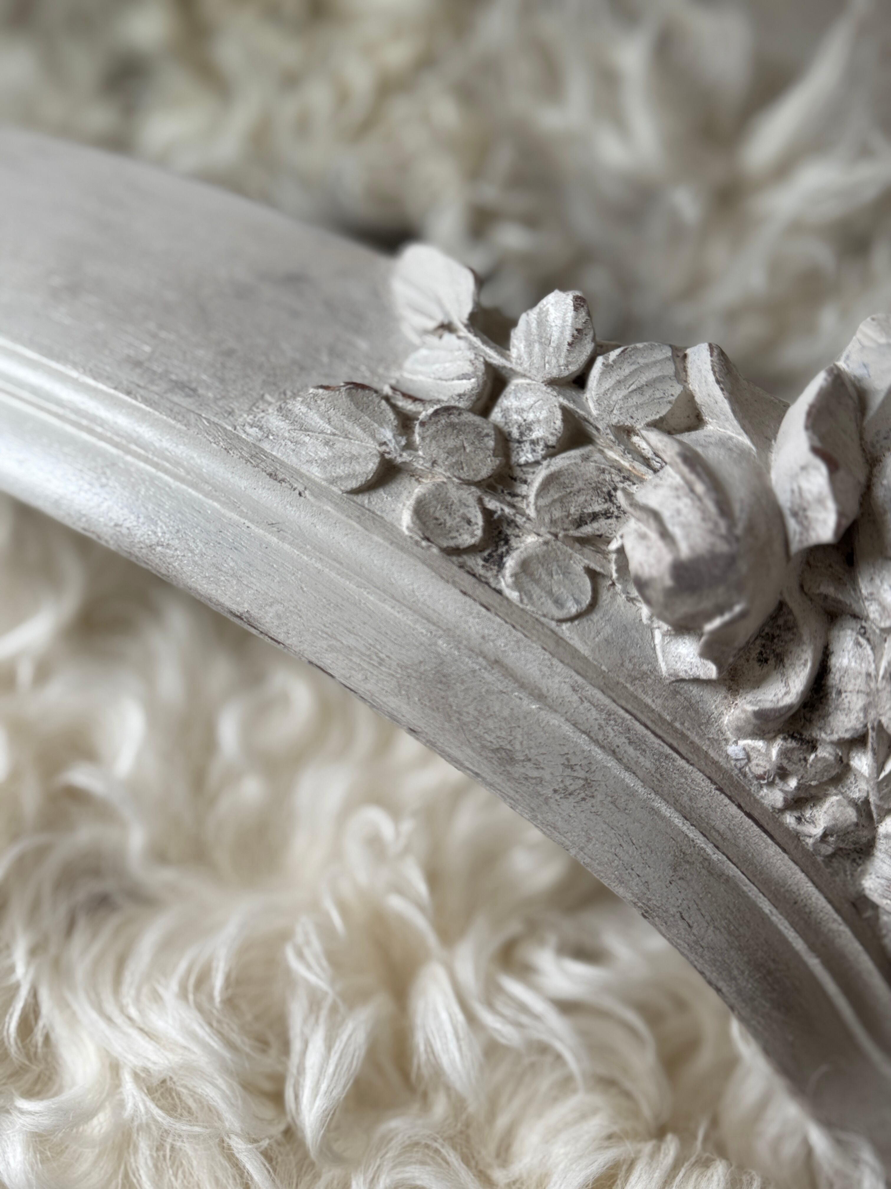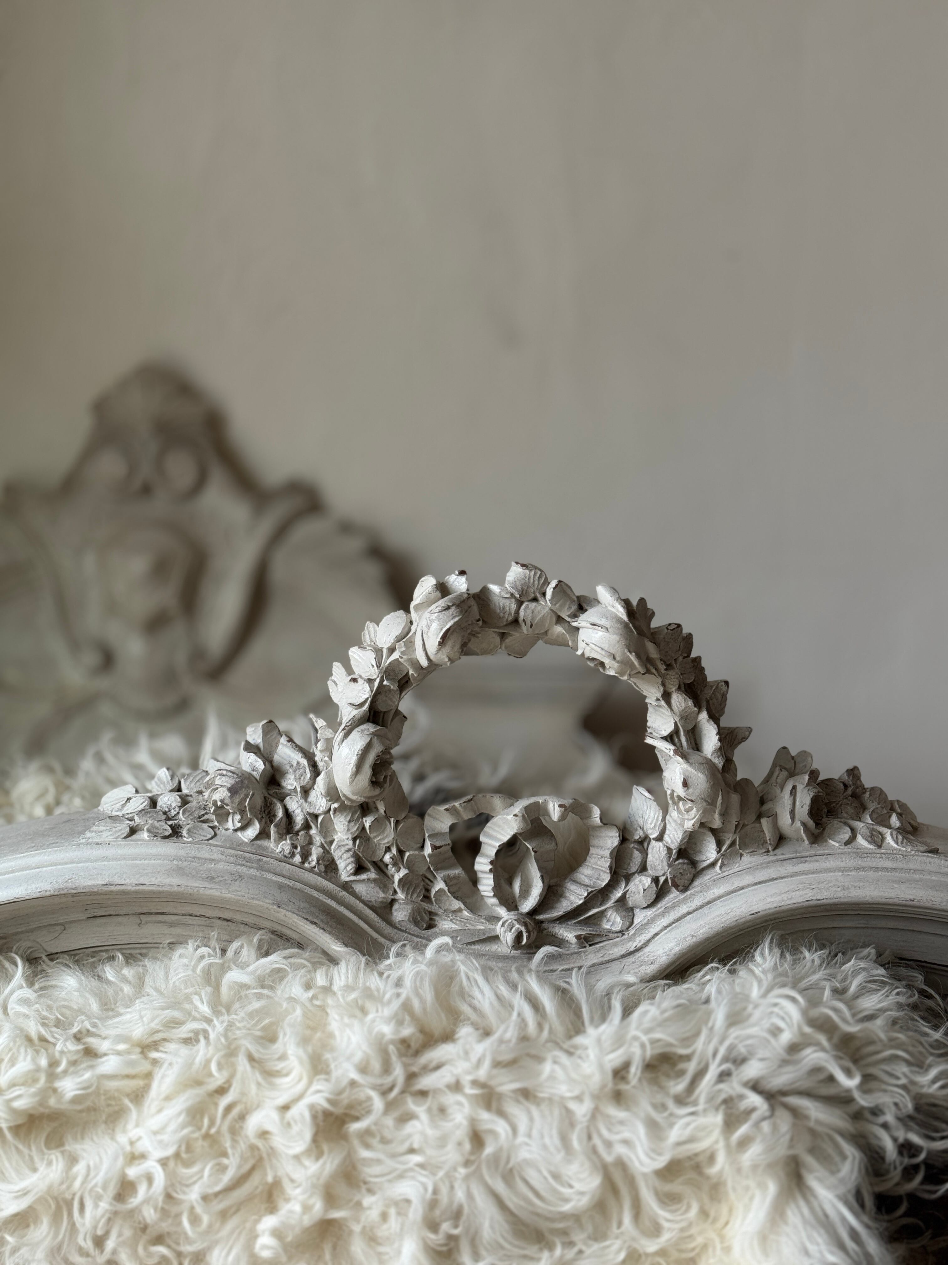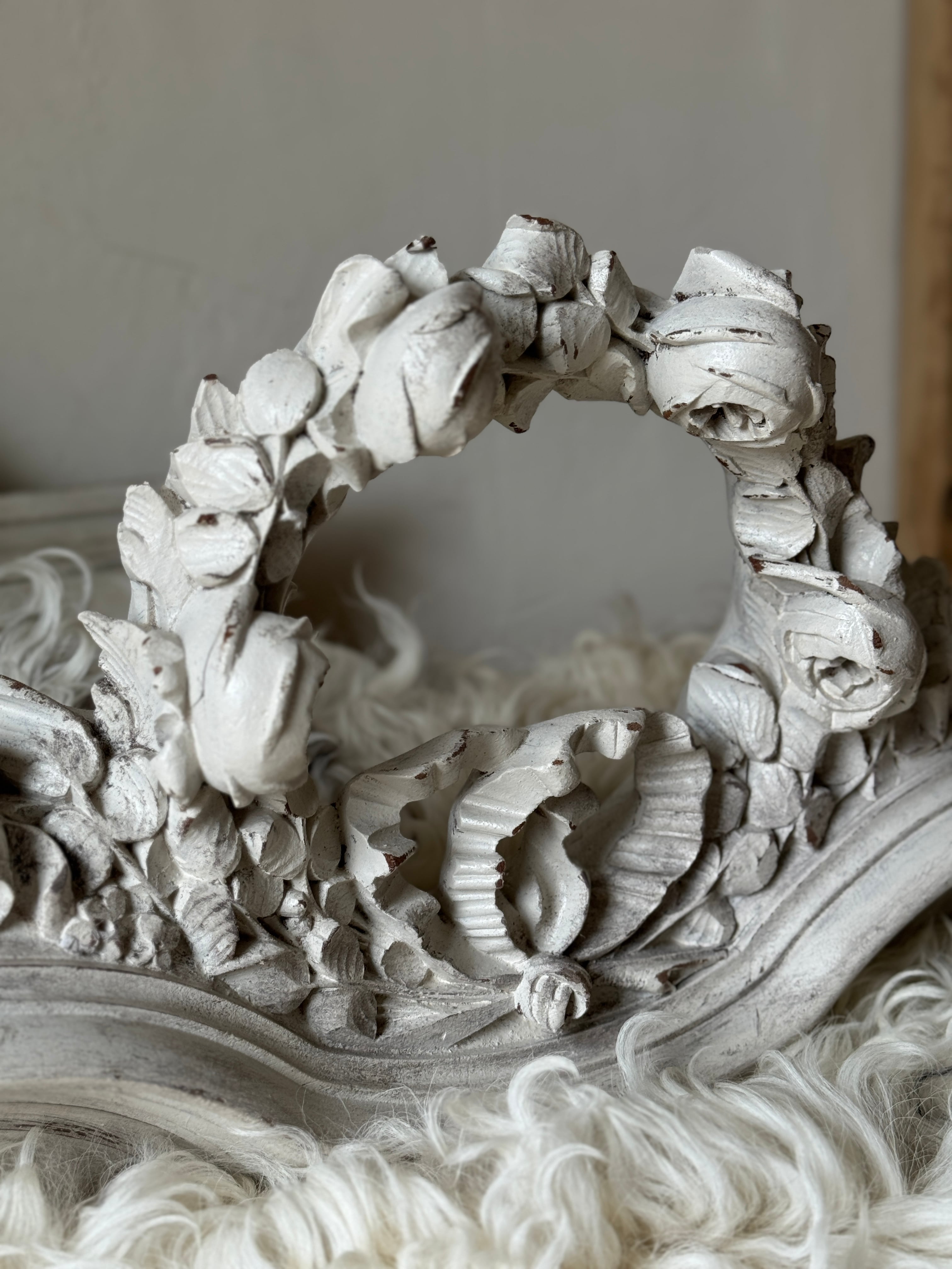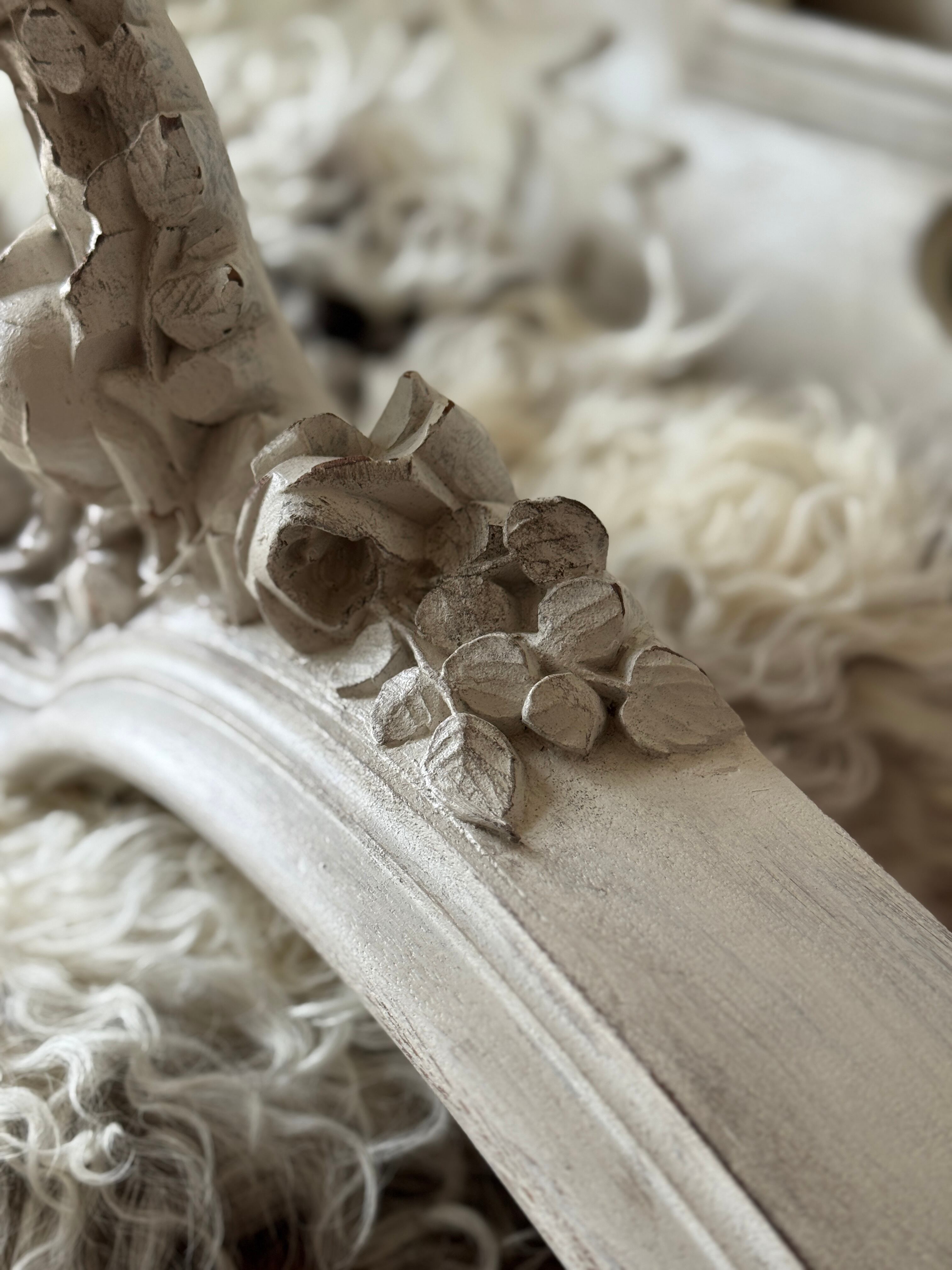 グレイ系ホワイトにペイントを施し、当時の職人さんによる豪華なカーヴィング(彫刻)が特徴的で、優美な曲線と薔薇やリボンをモチーフにした装飾が施されています。�