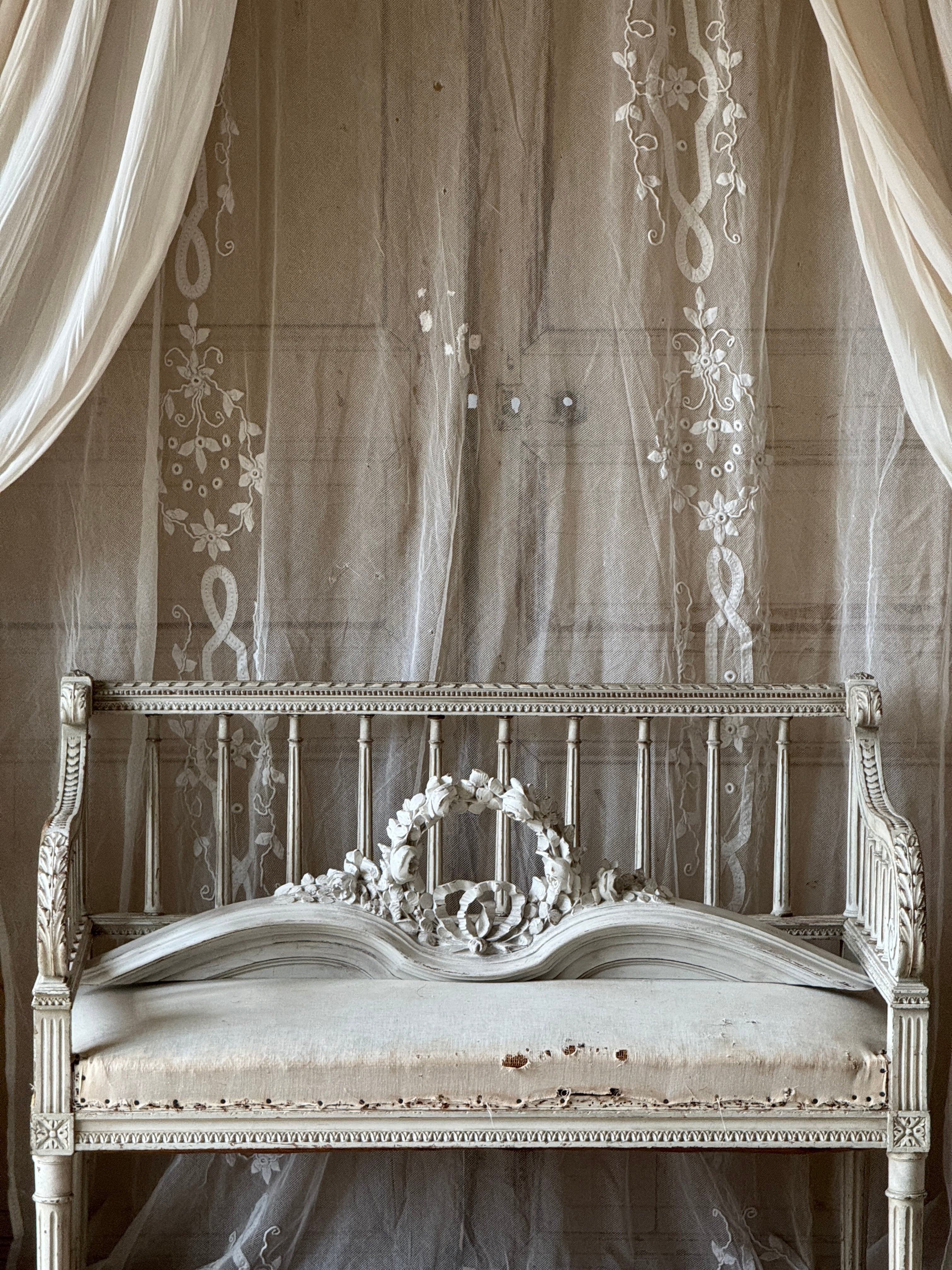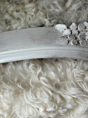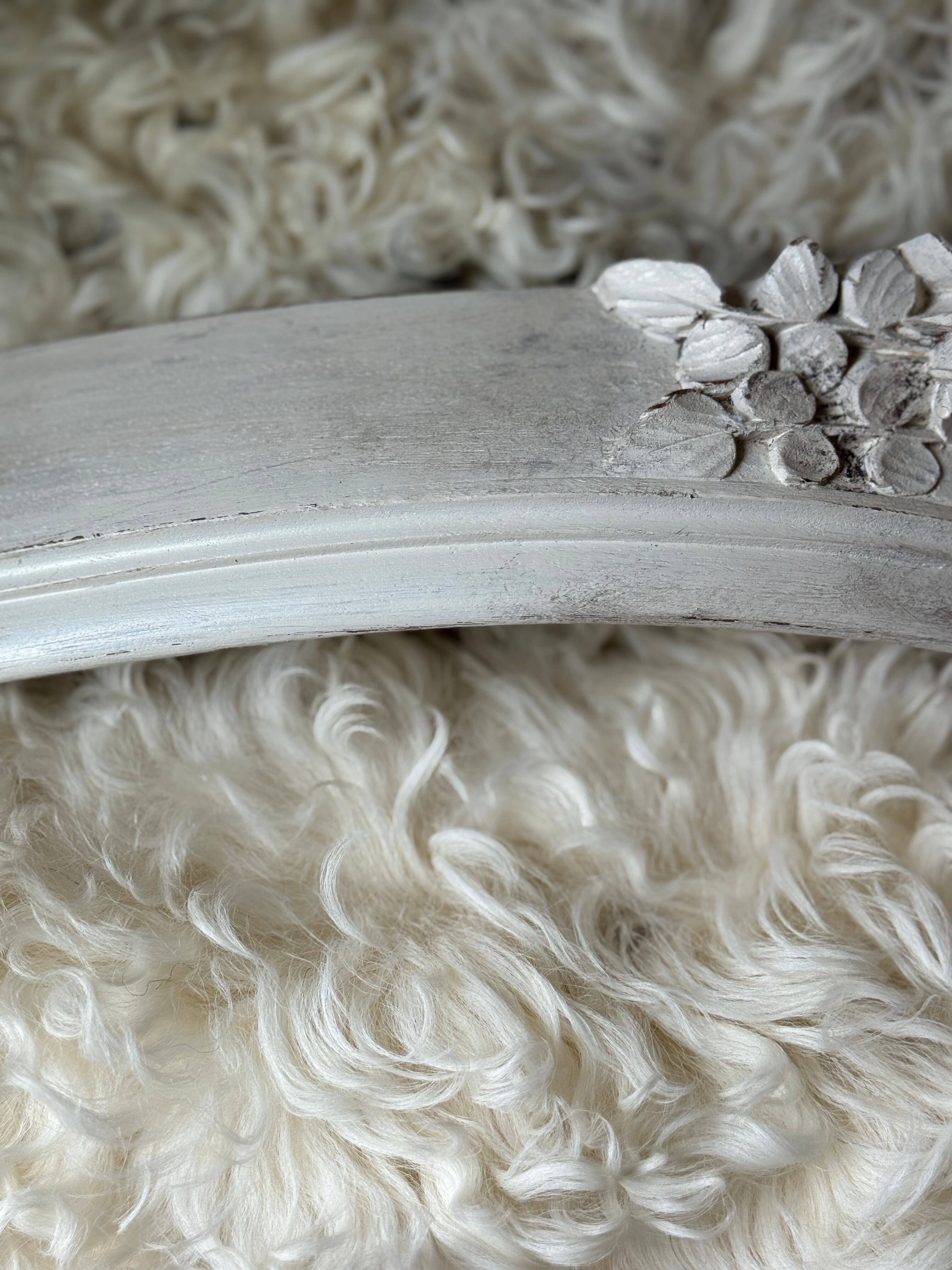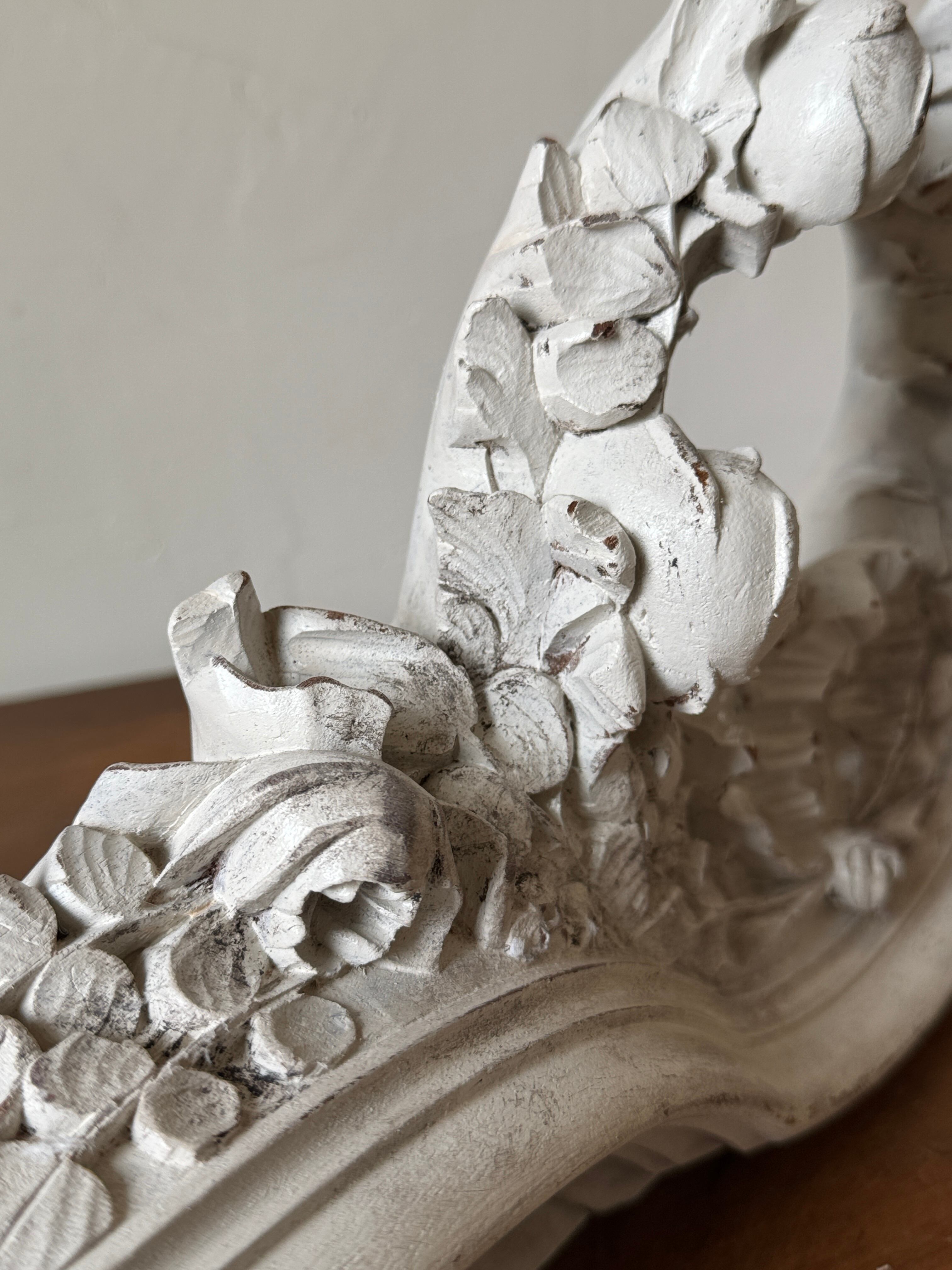 グレイ系ホワイトにペイントを施し、当時の職人さんによる豪華なカーヴィング(彫刻)が特徴的で、優美な曲線と薔薇やリボンをモチーフにした装飾が施されています。�