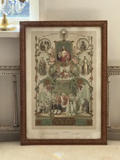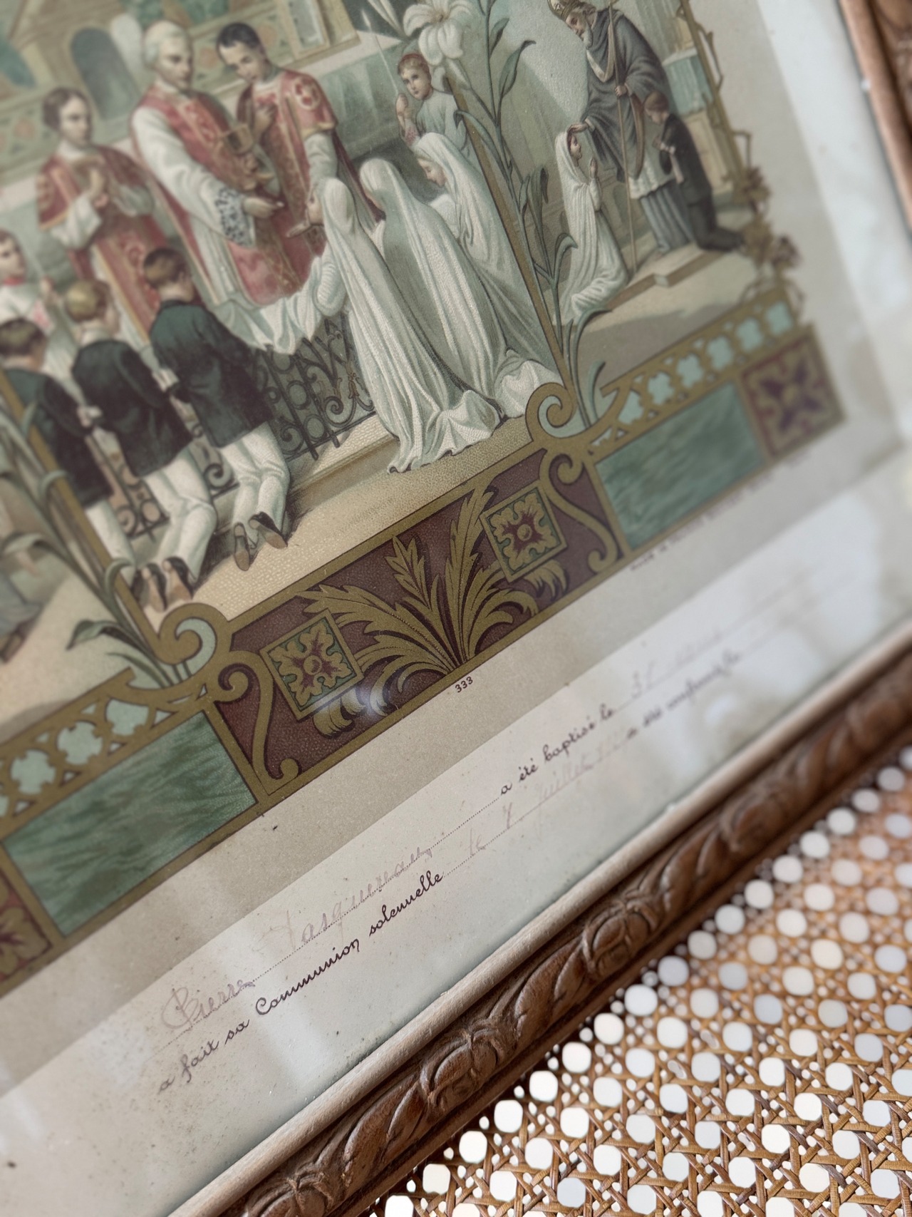 最初の聖体拝領(プルミエ・コミュニオン)」の儀式の様子が描かれ、その周囲に洗礼式や最後の晩餐などの宗教的な場面が配置されています。バラ、ユリ、ブドウの蔓、麦の穂といったキリスト教的な象徴が枠を彩っています。