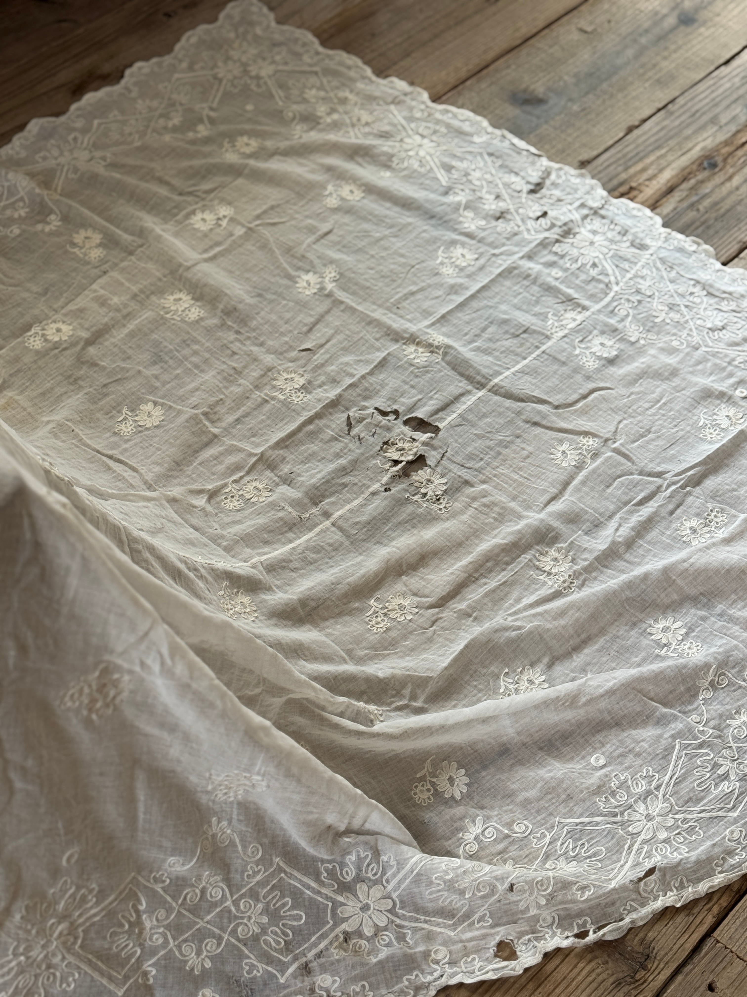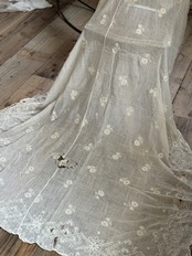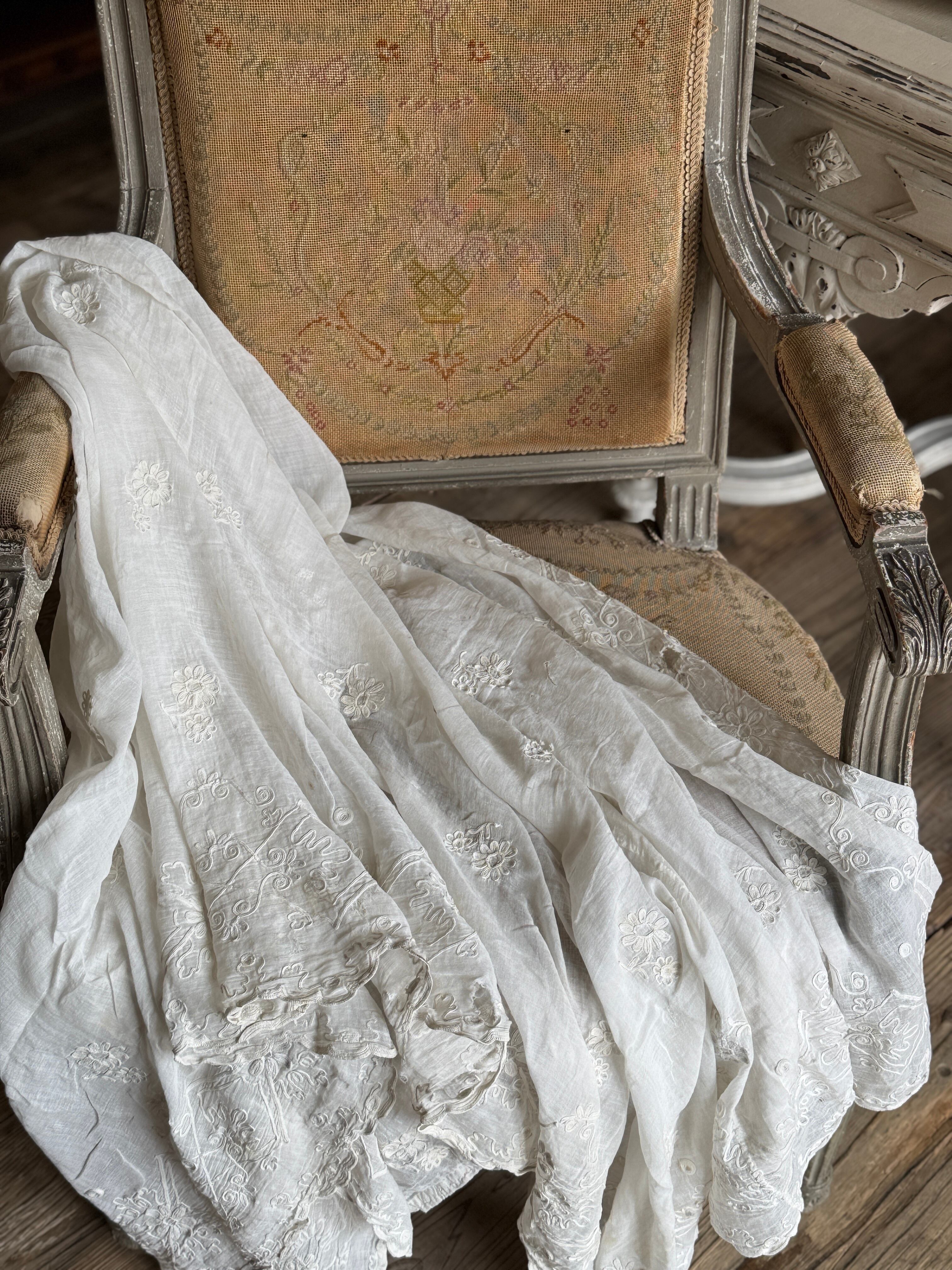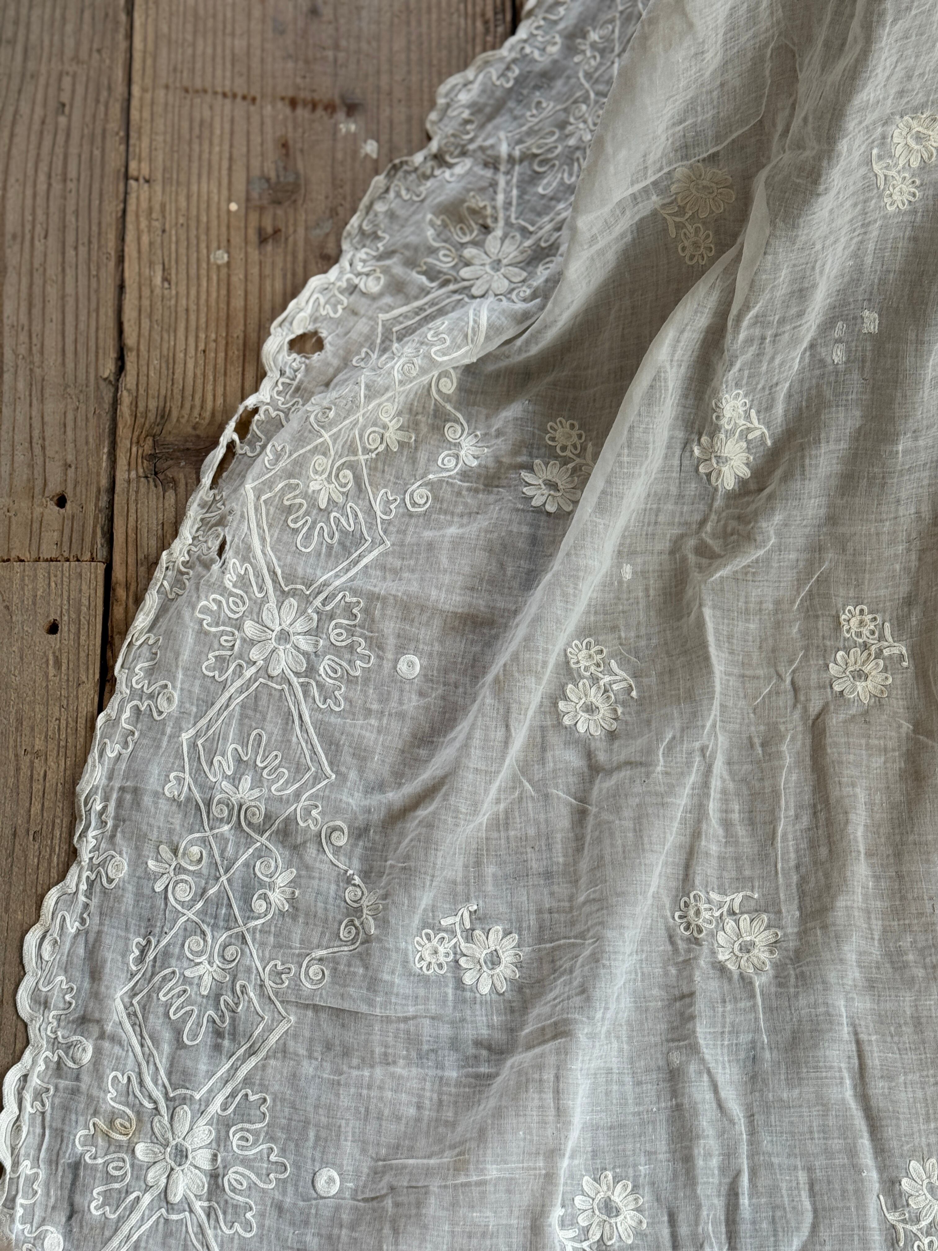 非常に薄く柔らかなコットンローン生地が使われていて、チェーンステッチで花や葉、スクロール模様などが描かれています。年月を経たノスタルジックな風合いが特徴です。