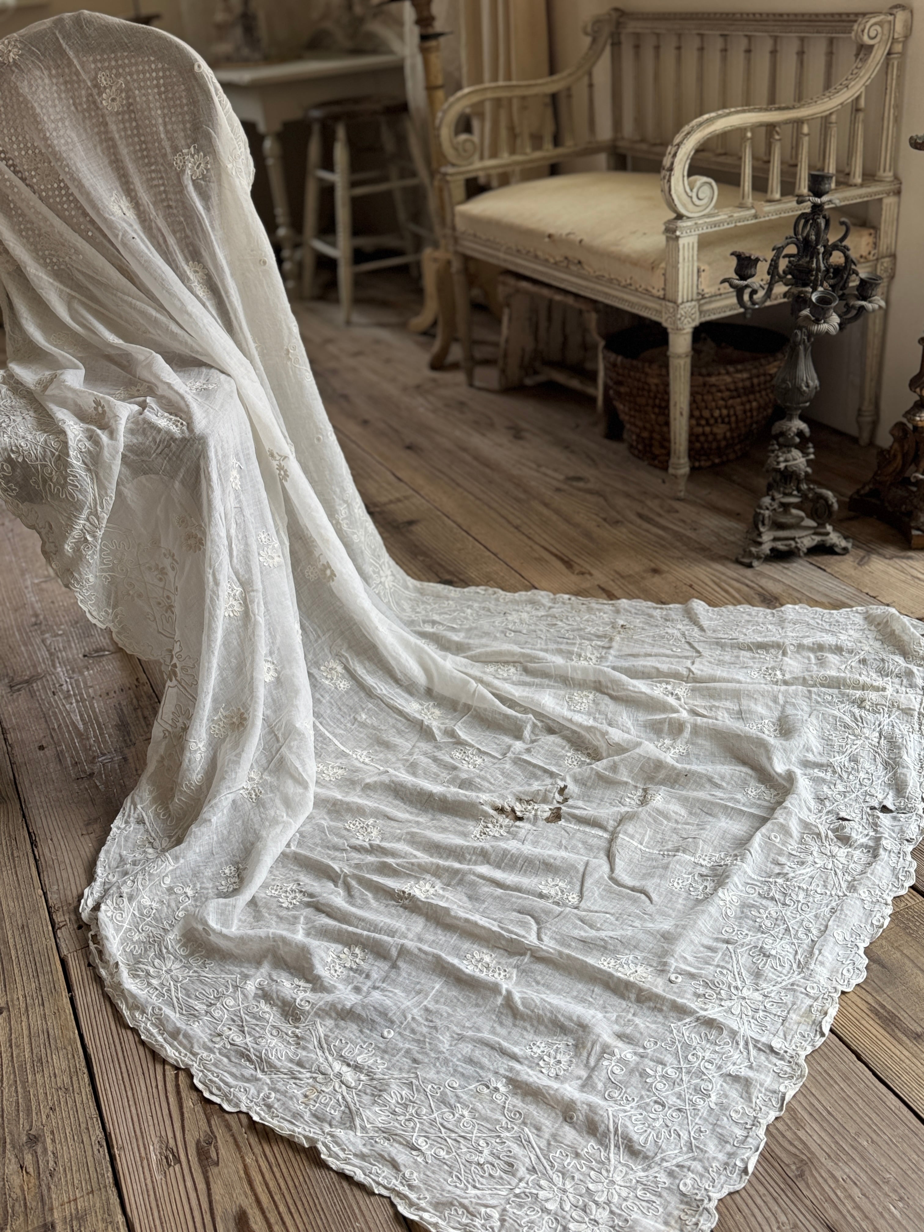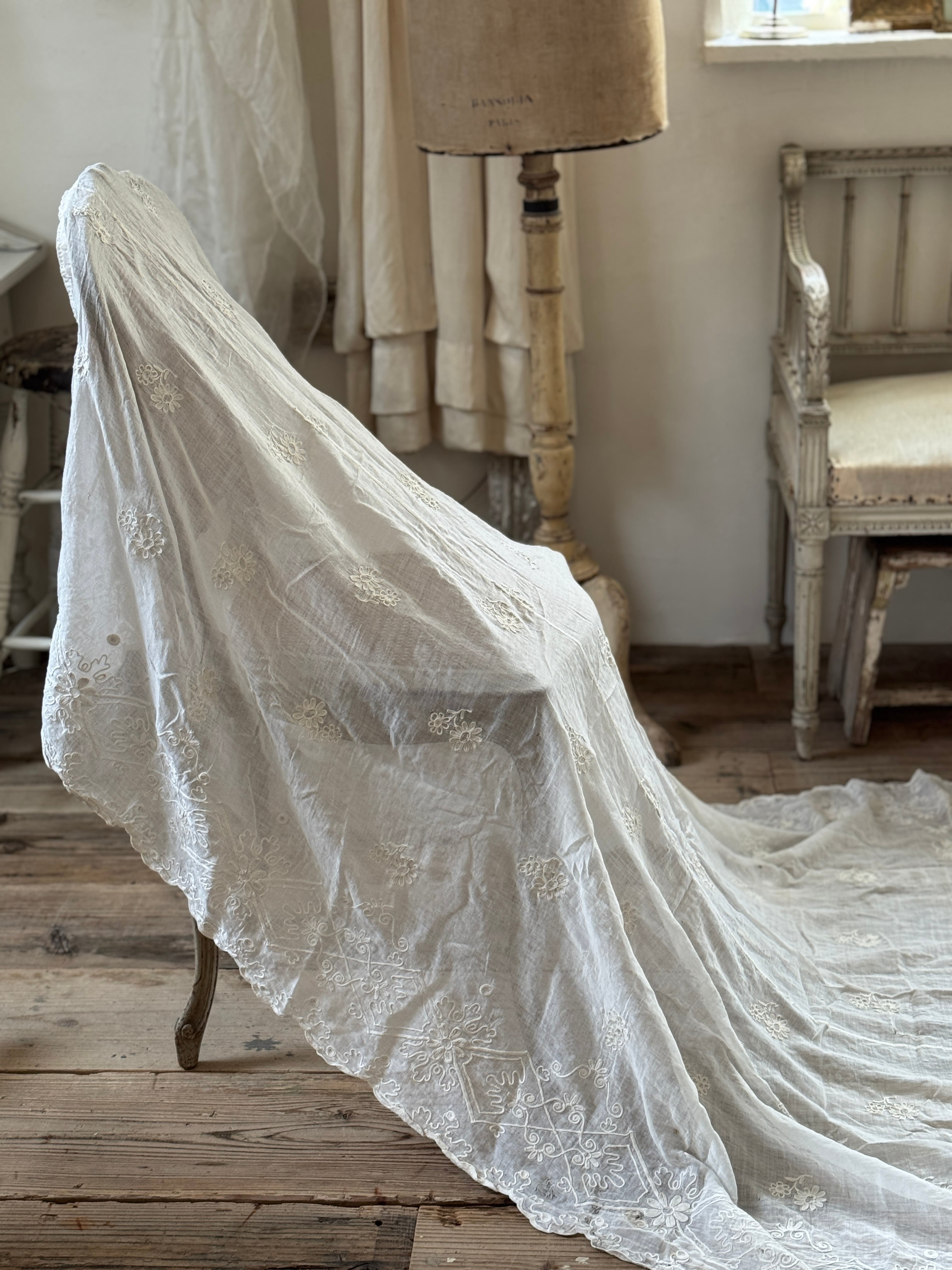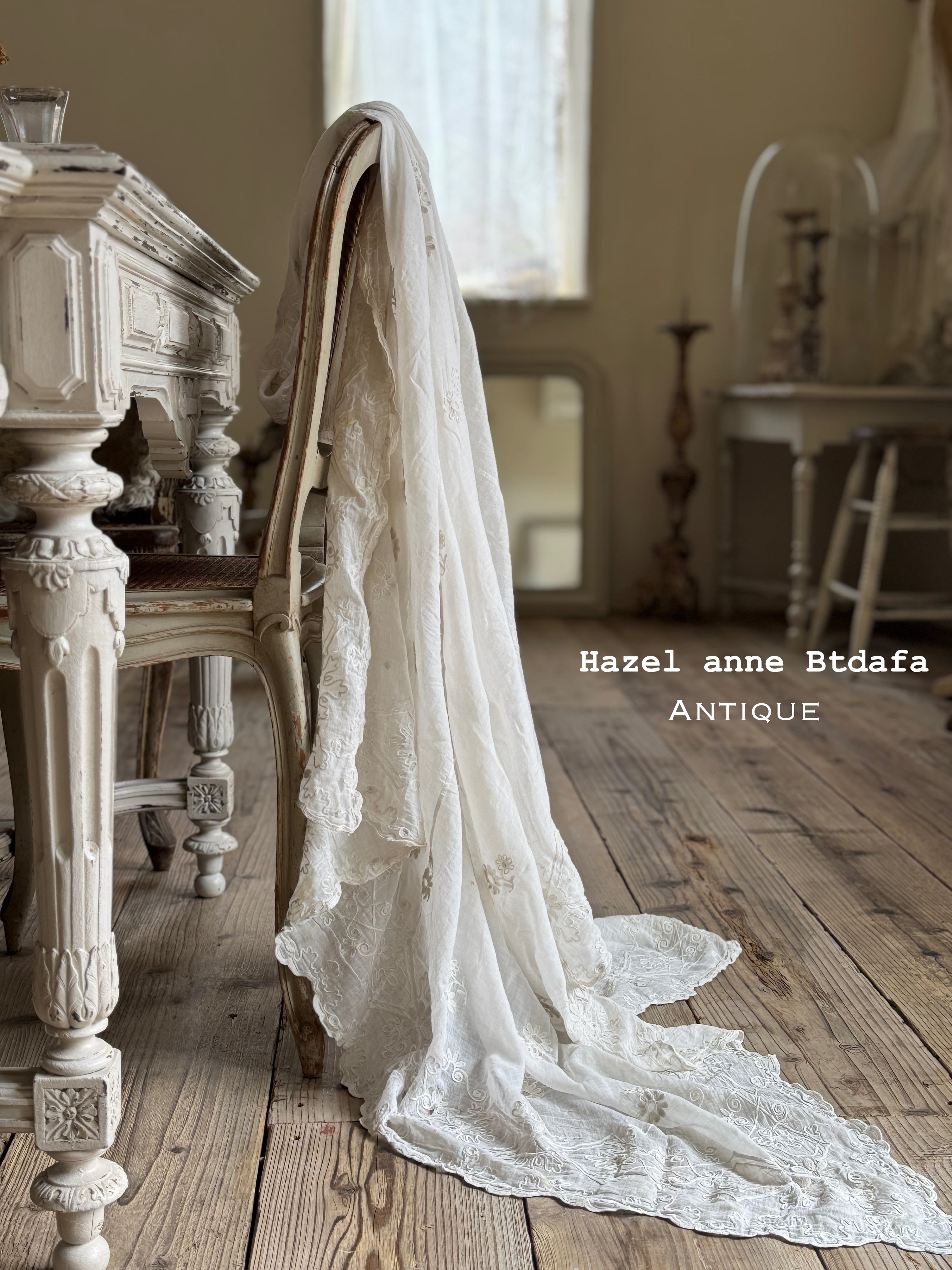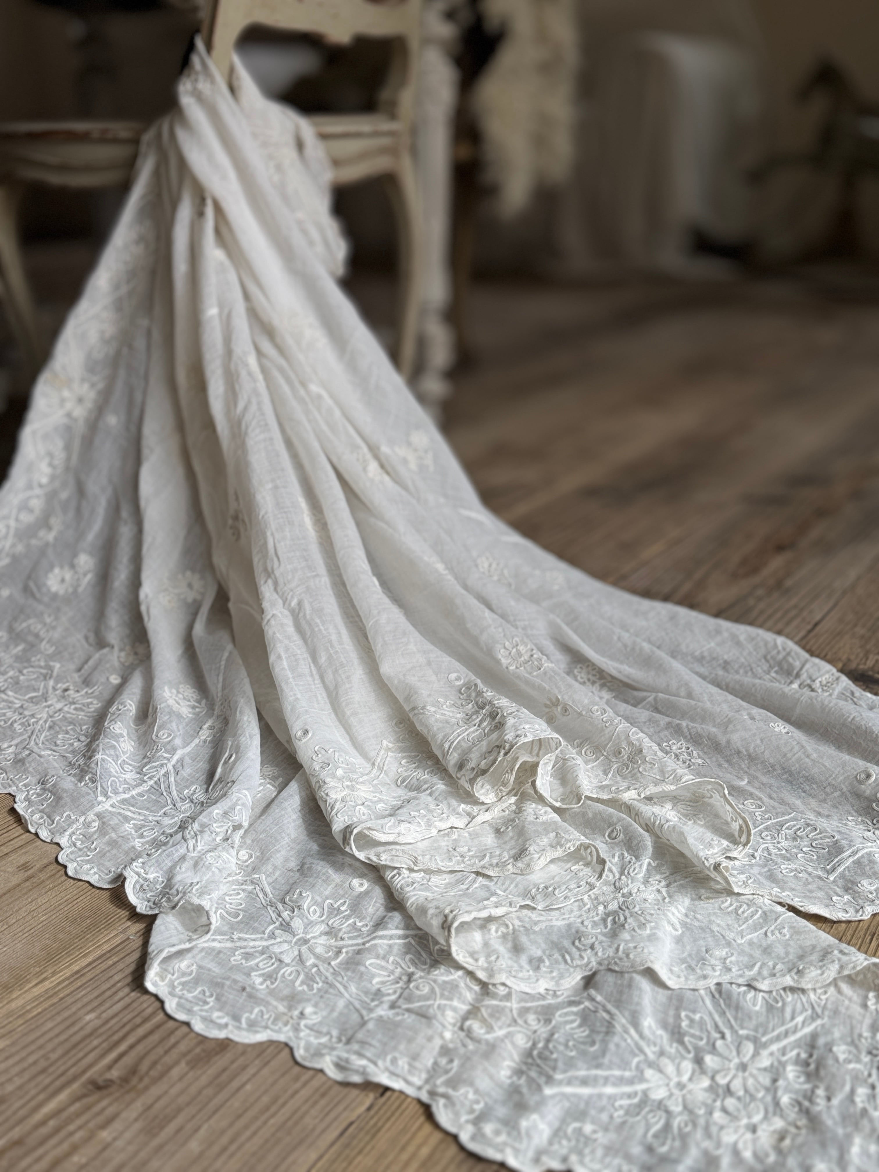 非常に薄く柔らかなコットンローン生地が使われていて、チェーンステッチで花や葉、スクロール模様などが描かれています。年月を経たノスタルジックな風合いが特徴です。
