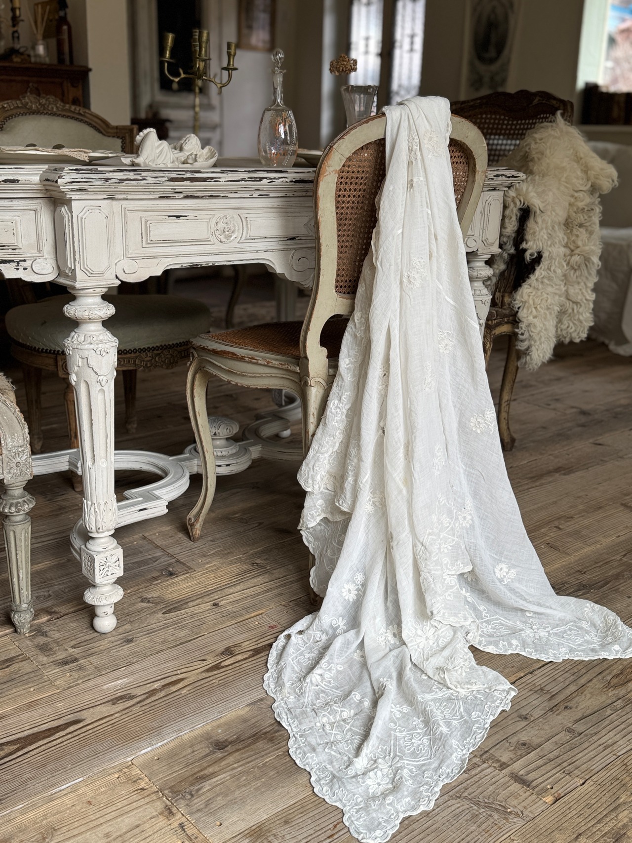 繊細なチェーンステッチの刺繍が特徴的なフランスのアンティーク・コーネリーレース(Cornely Lace)カーテンをご紹介致します。