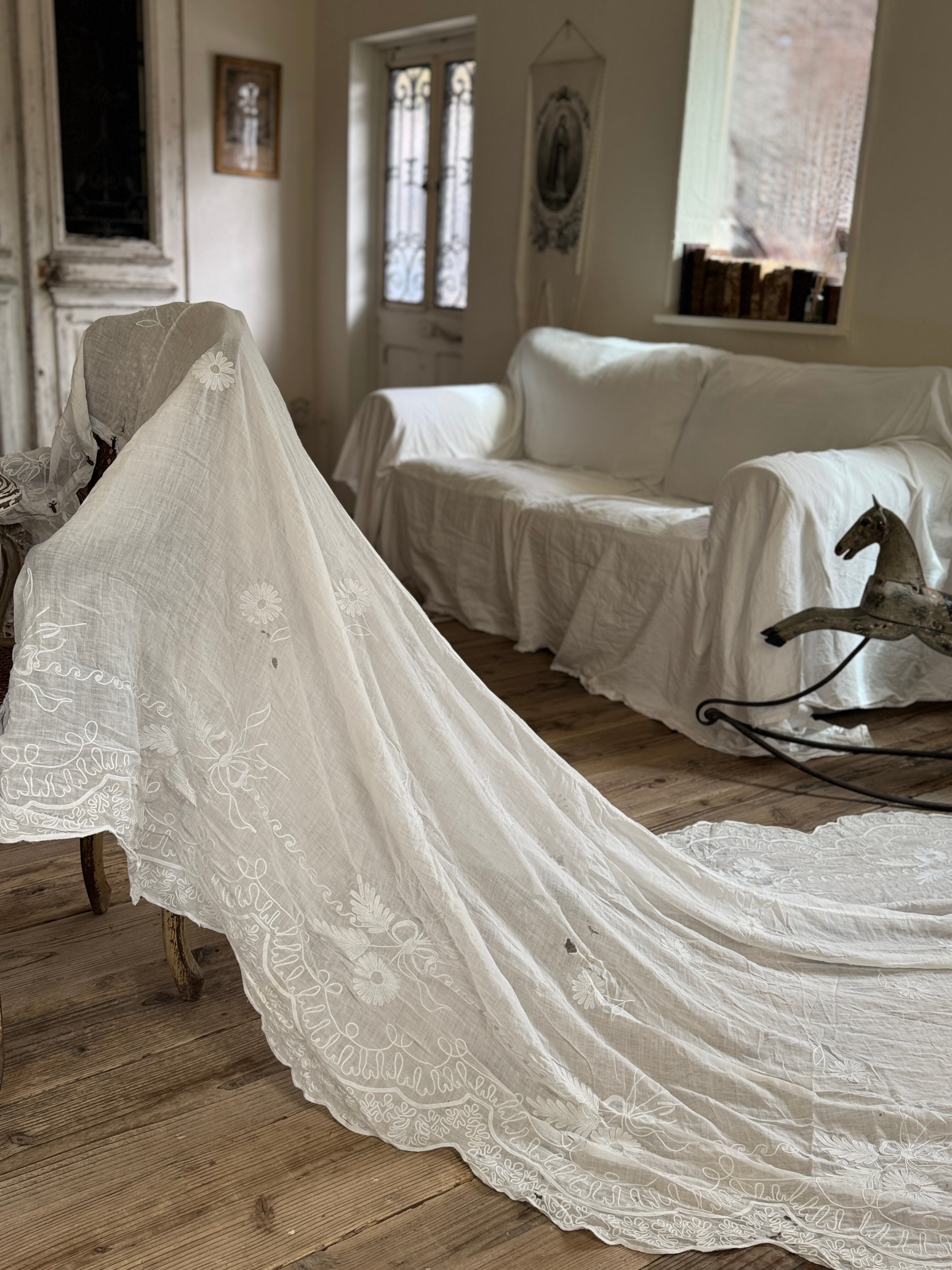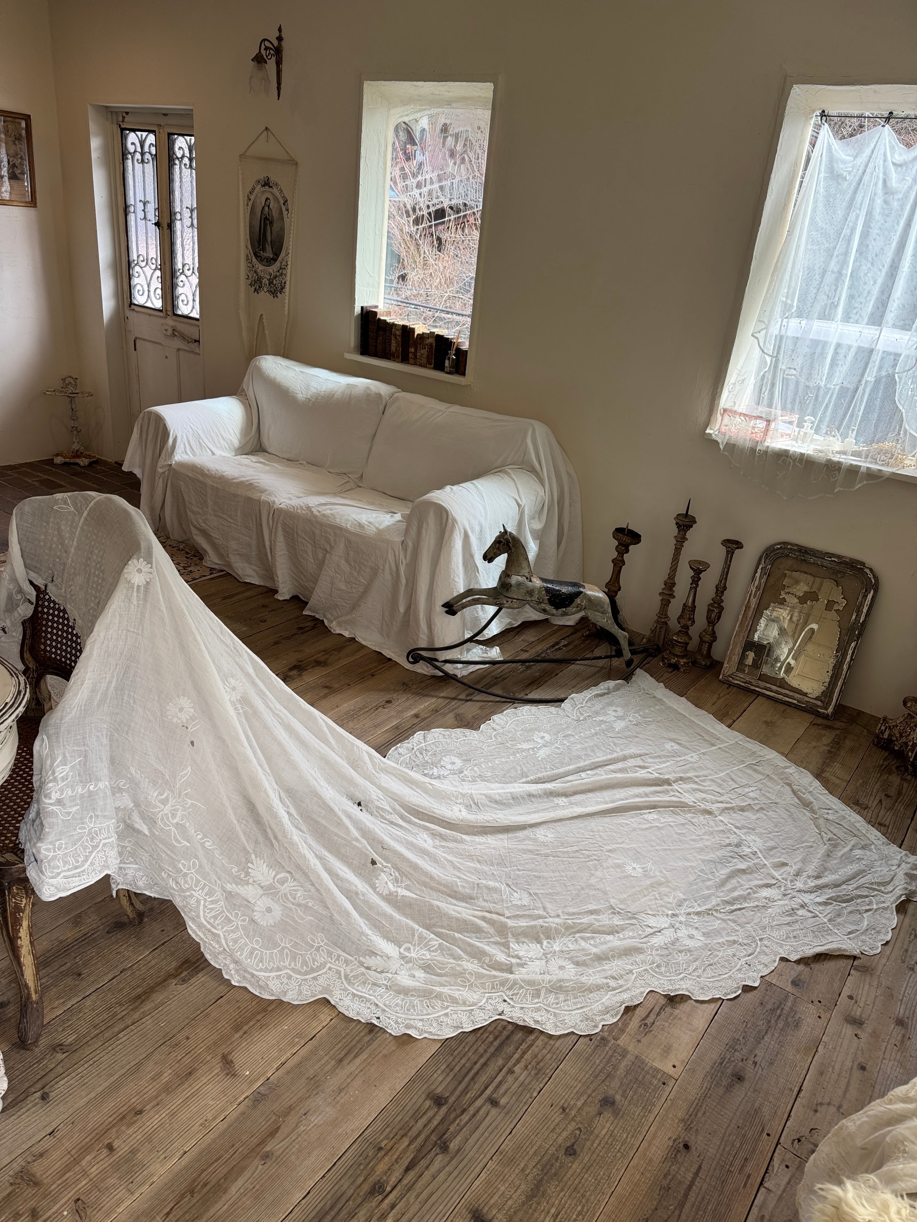 こちらのアンティークカーテンは、そのまま窓辺で使うだけでなく、間仕切りやパーテーションとしても人気があります。