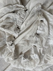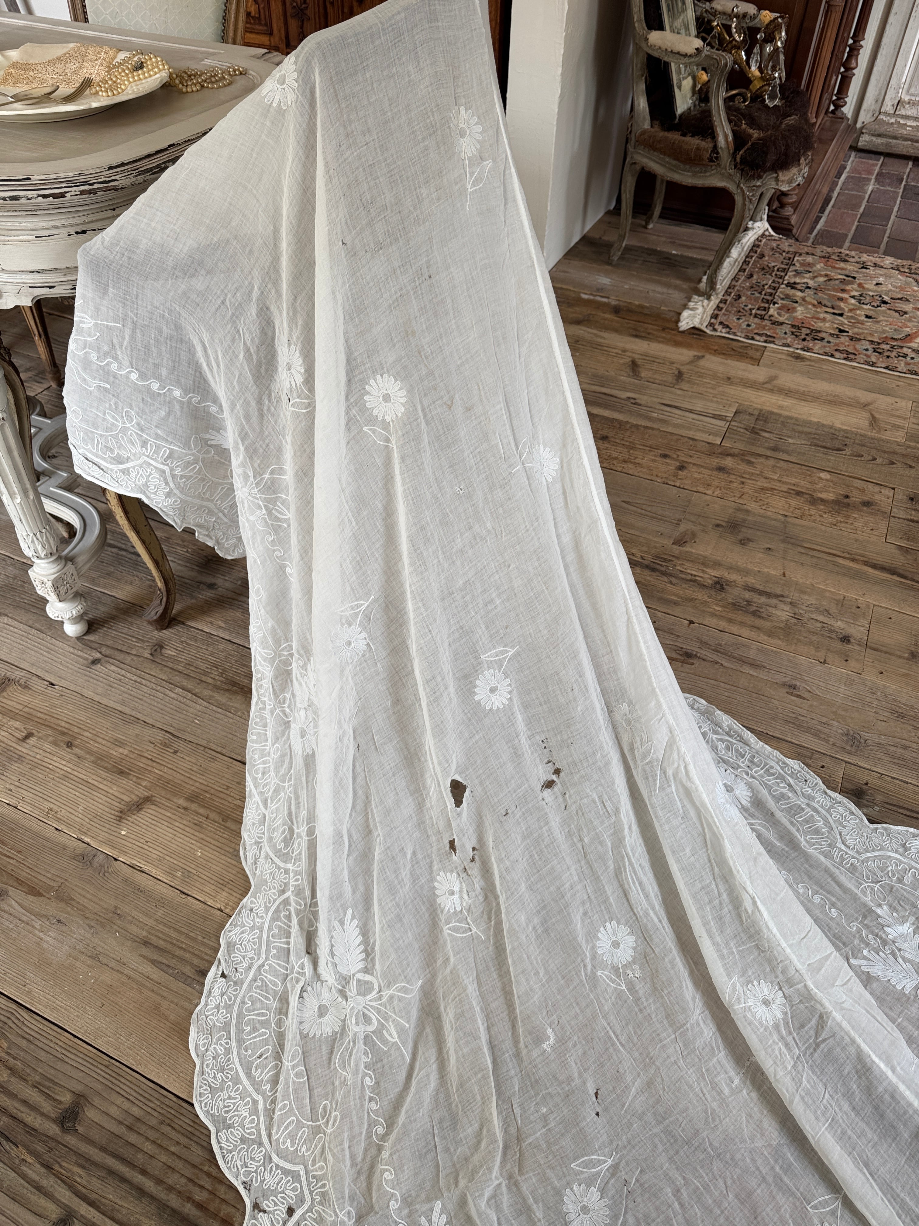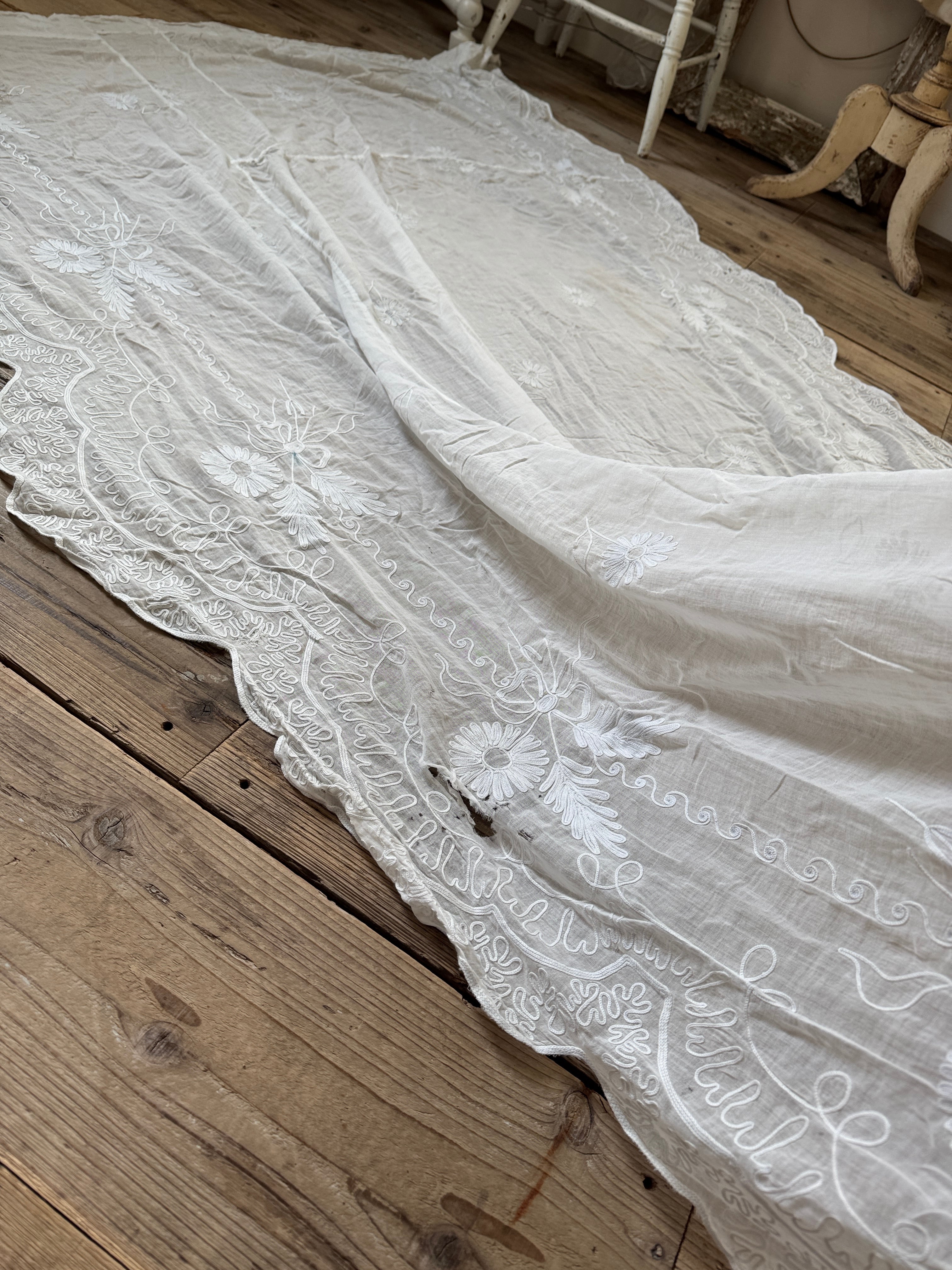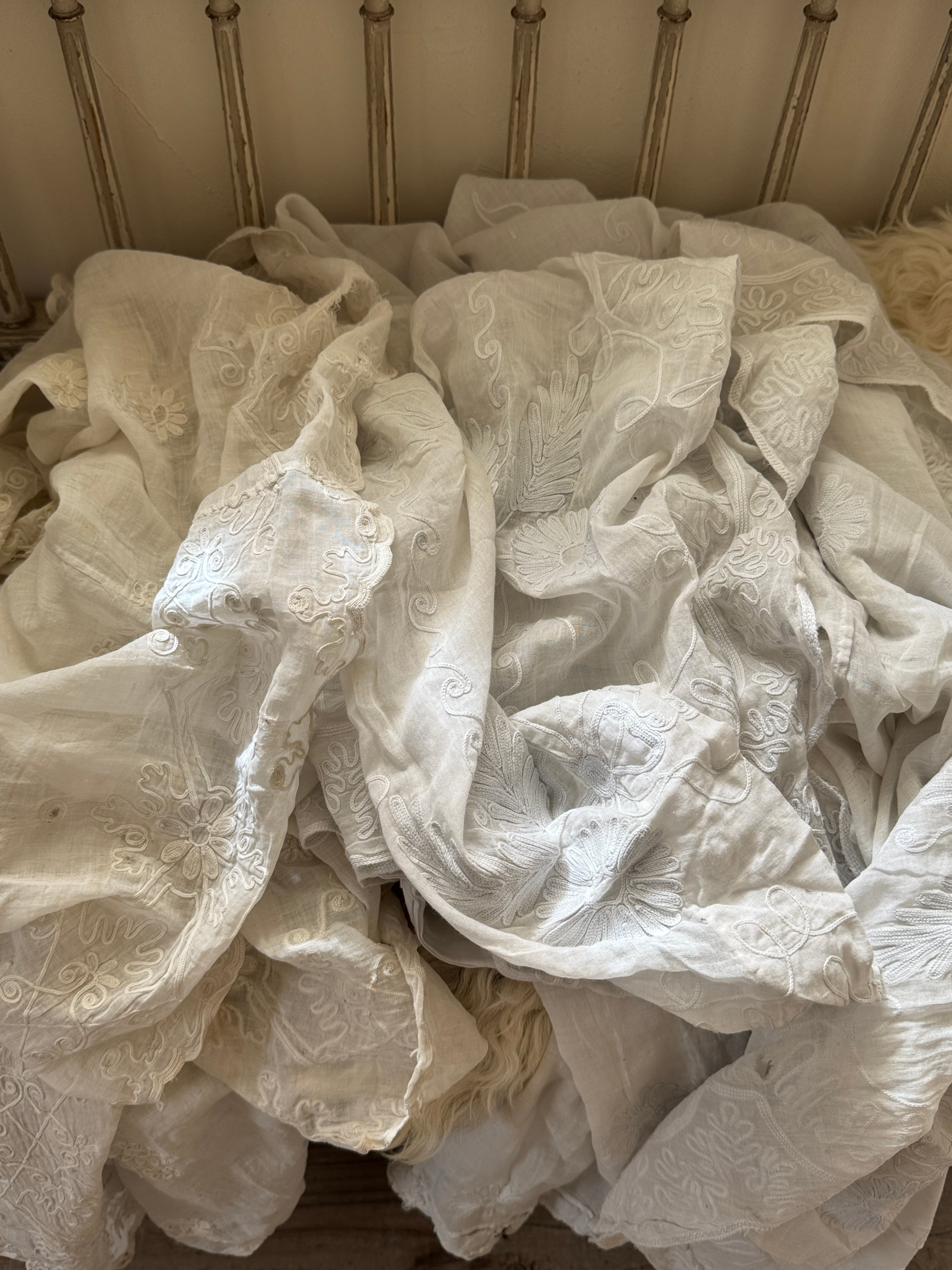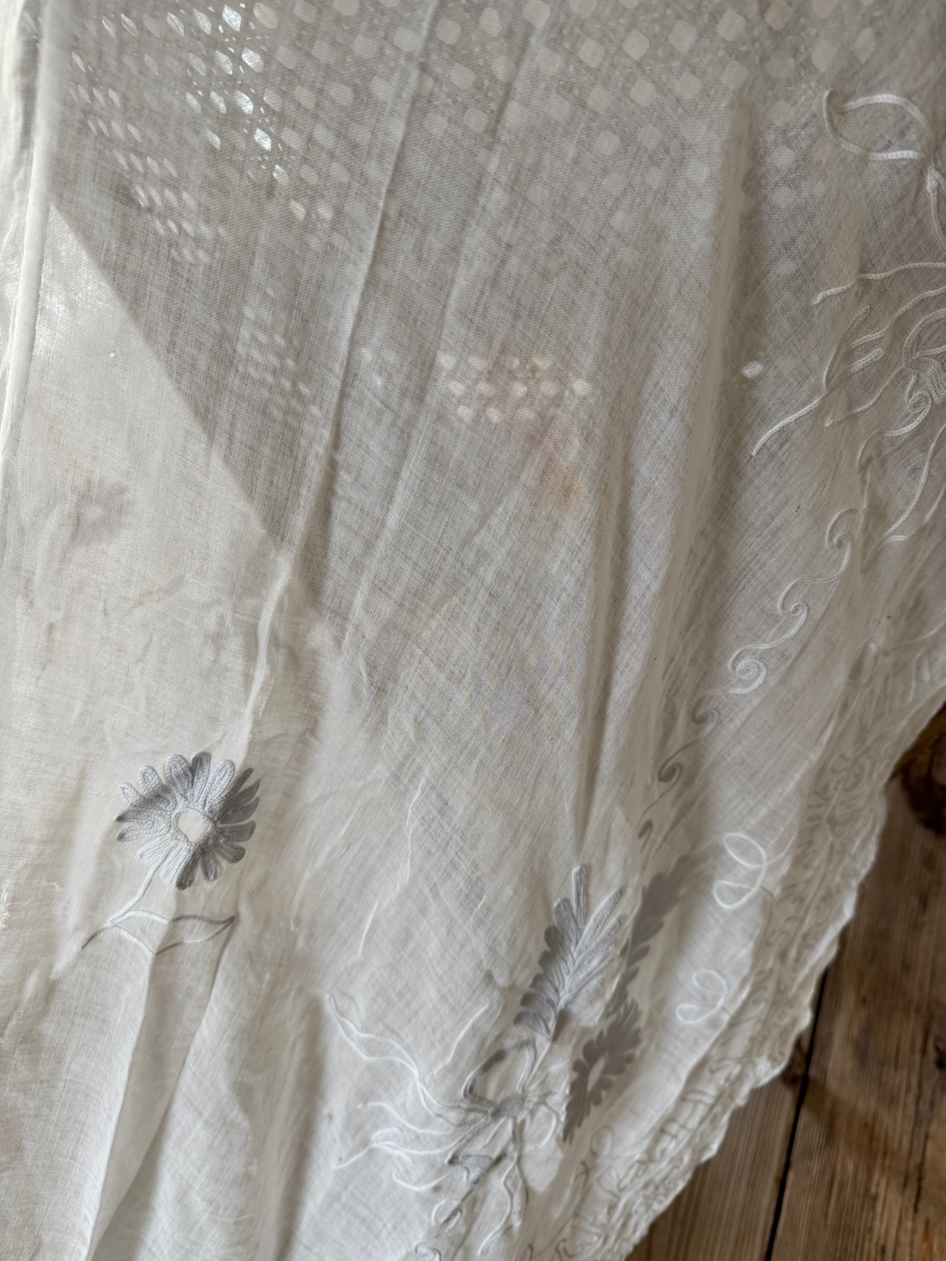 非常に薄く柔らかなコットンローン生地が使われていて、チェーンステッチで花や葉、スクロール模様などが描かれています。年月を経たノスタルジックな風合いが特徴です。