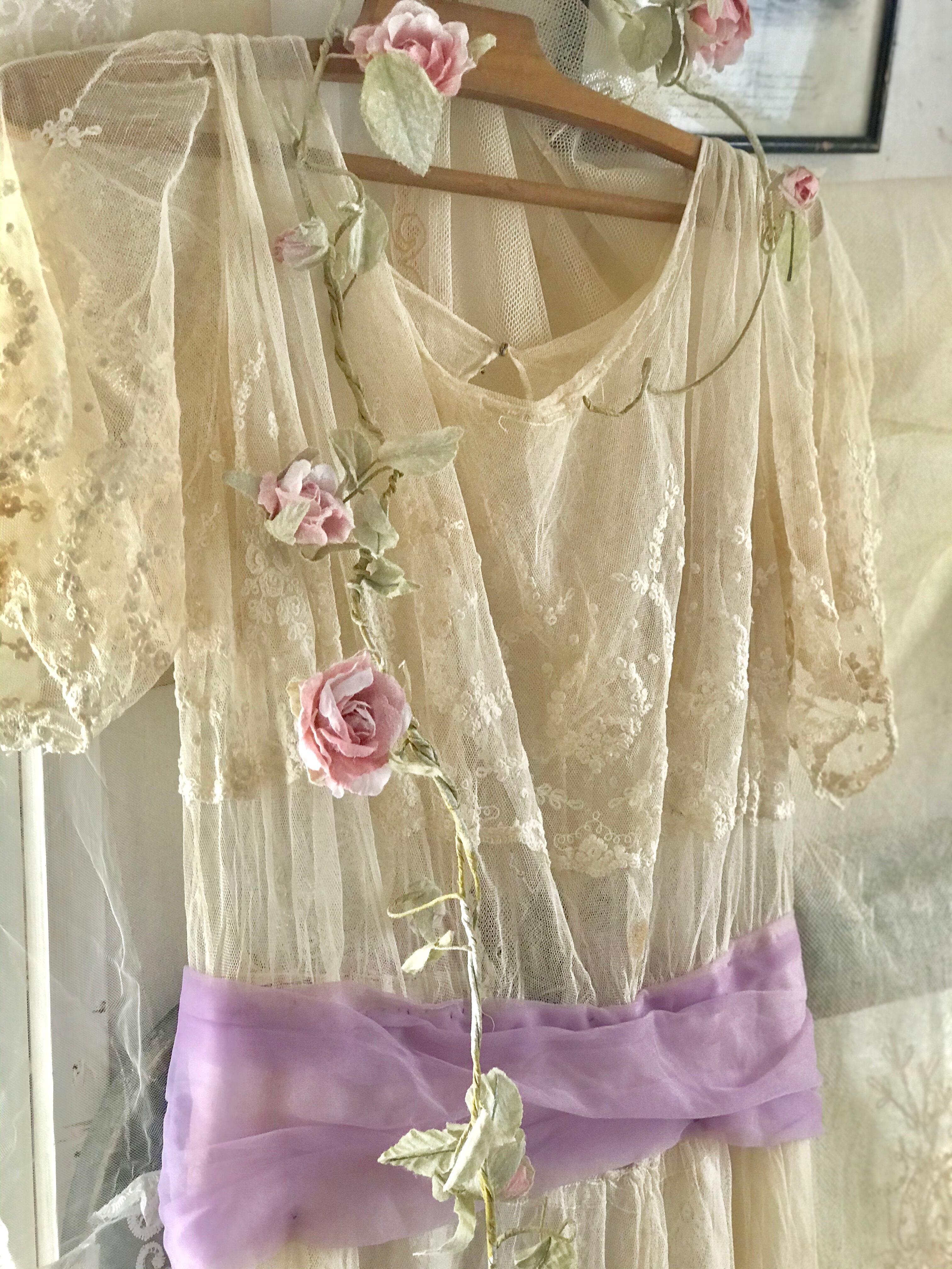 見事な総レースに透け感が大変美しく、バイオレットのサシェ付きが清純さを際立たせています。