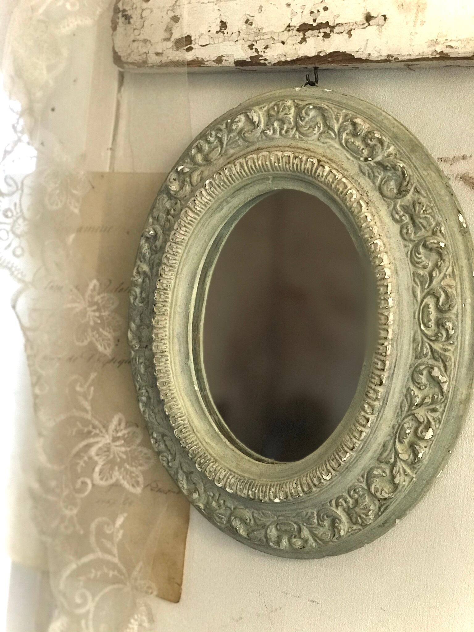 青みがかったフレンチホワイトのデコラティブフレームが素敵なミラーです。
