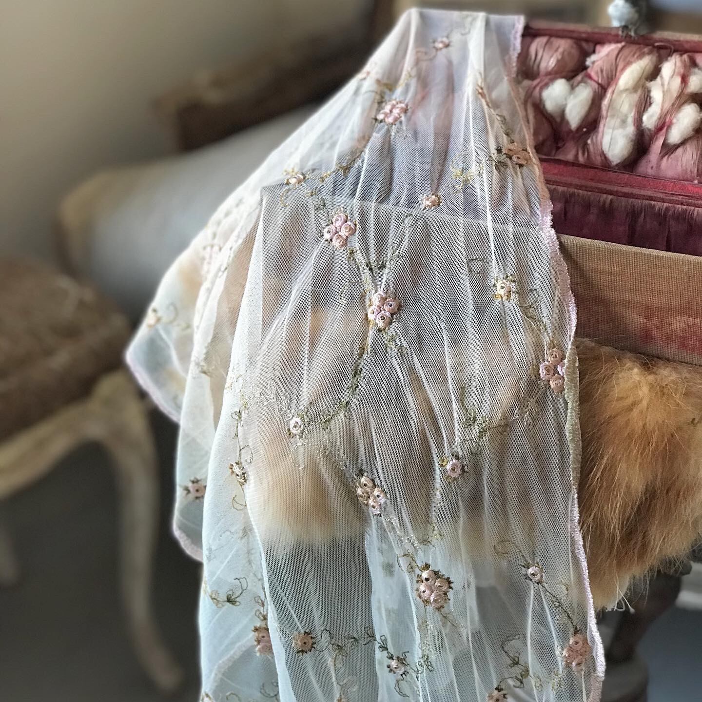 小さなピンクローズの刺繍が可愛いらしいヴィンテージ レースです。