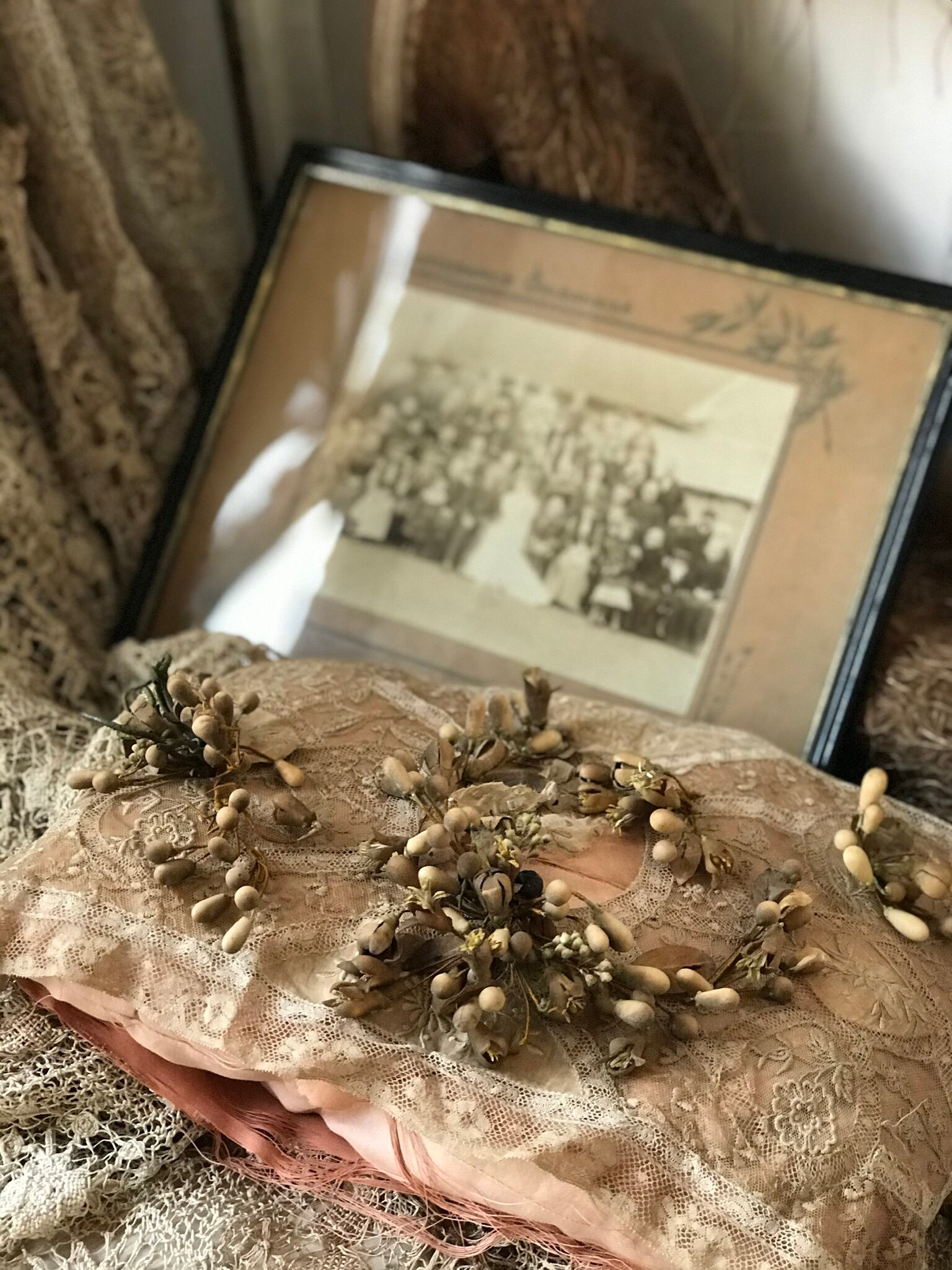 ワックスフラワーのパーツ部分取れてしまっていますが、充分なボリュームと世界観は絵の様な感慨深さがあります。