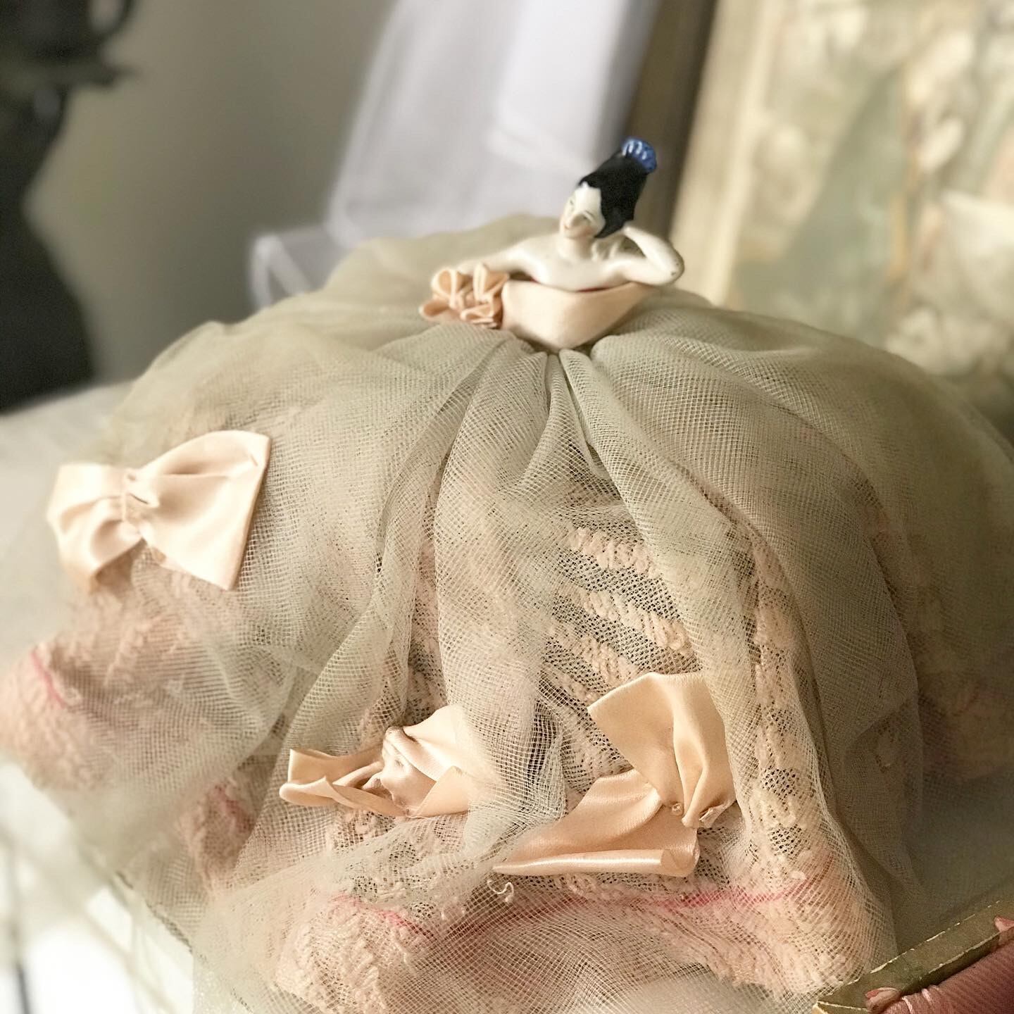 ピンクッションのハーフドールはよく見かけますが、裁縫箱は初めて私も出会いました。透け感のあるふんわりヴィクトリアンドレスに可愛いらしいピンクのリボン、ブドワールな雰囲気がとても素敵です。