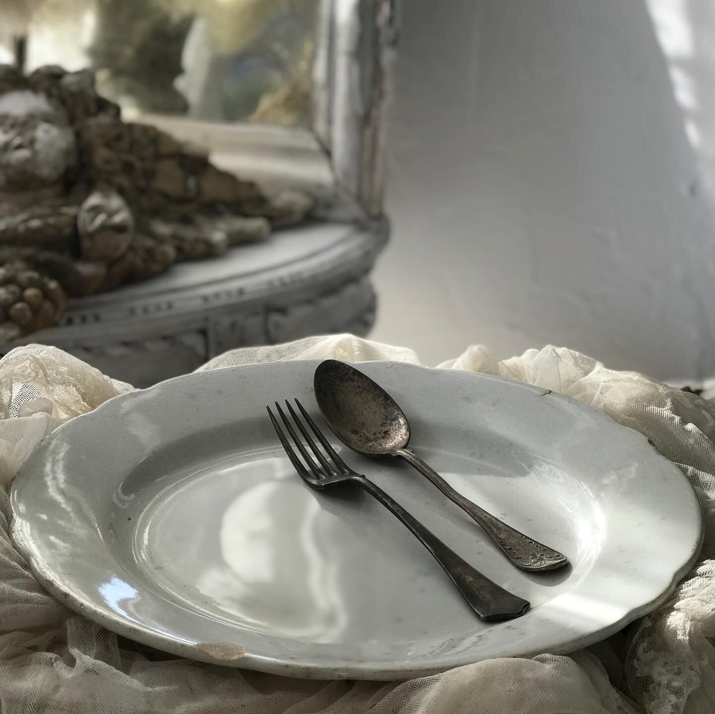 古い陶器ならではの白の質感と、枯れた風合い、緩い花形のリムになっています。