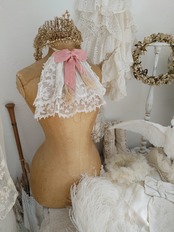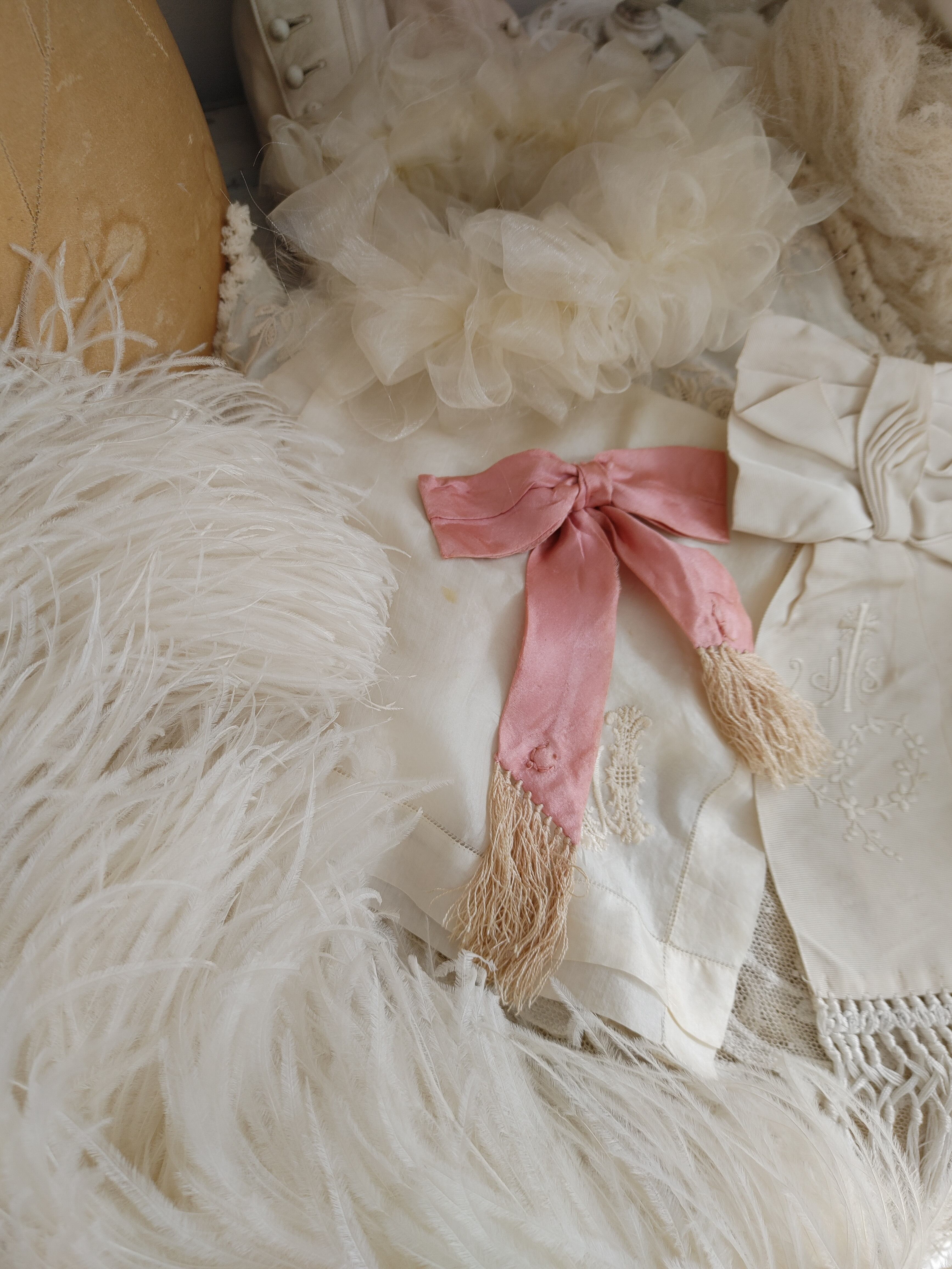 大変古いフレンチブドワールのシルクリボンです。1800年代中期によるもので、甘いピンクにエクリュ色のフリンジが可愛いらしいリボンです。