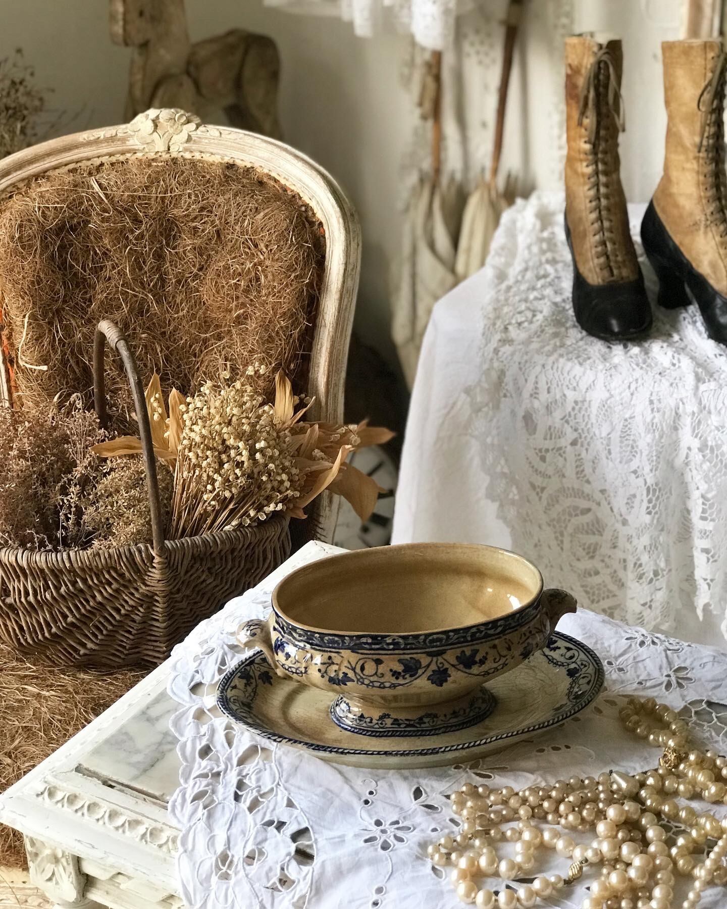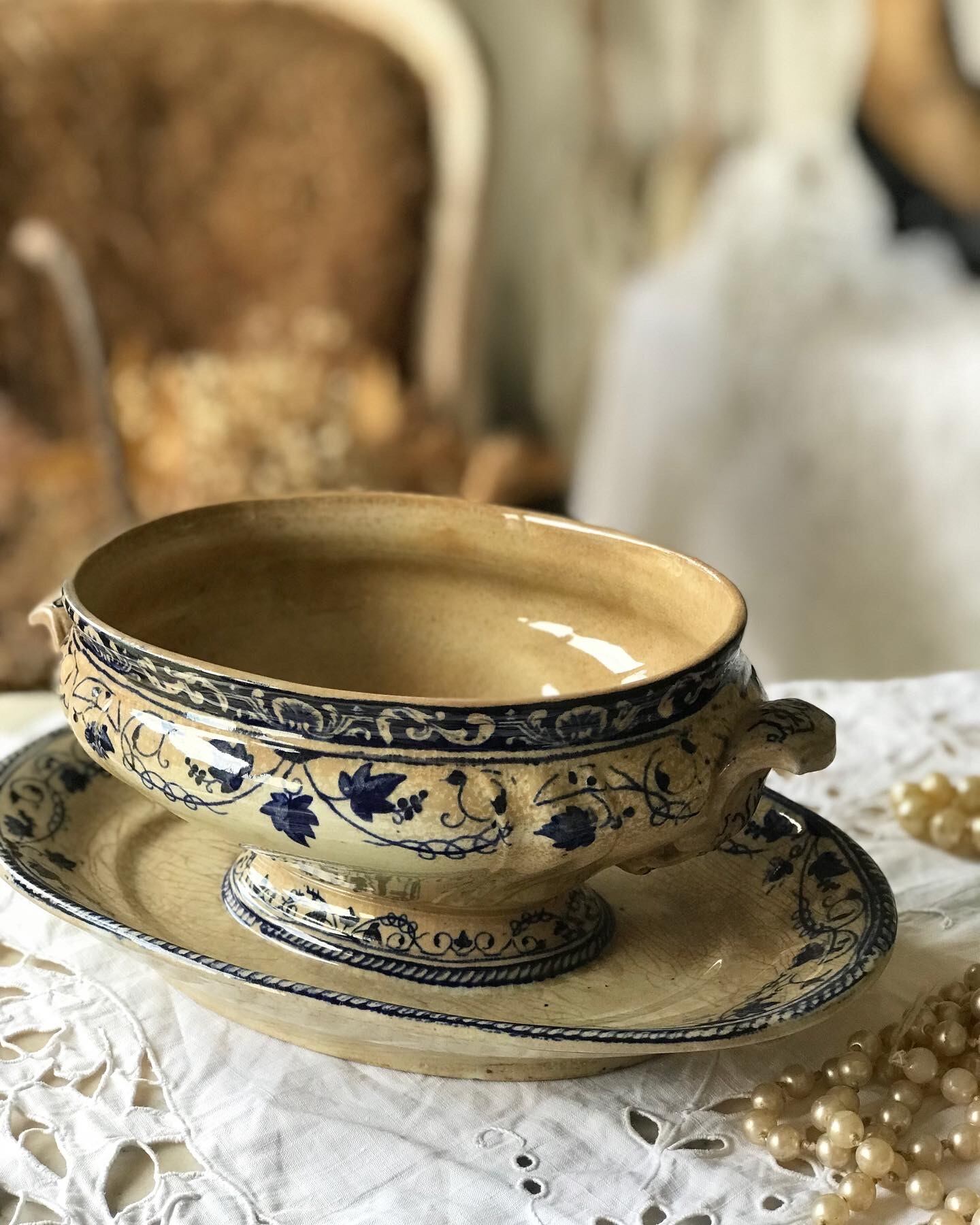 長い歴史の中でゆっくりと飴色になった艶やかな質感や、ブルーが深く繊細に描かれた植物のデザイン、エナメル質に溶け込む貫入の美しさを感じて頂けます。